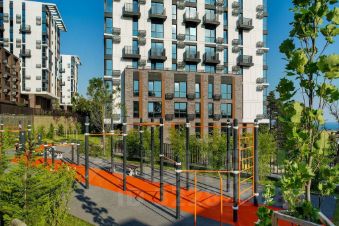 Есть магазины, детские комнаты, кофейни и кафе прям на территории. Для детей есть спортивные, детские, а так же футбольная площадка.