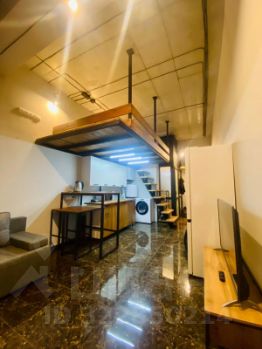 Высота потолков - 4,5 м, что позволило обустроить полноценное спальное место на втором уровне.
