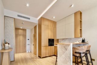 Качественные материалы в отделке — керамогранит, натуральный камень в отделке, деревянные панели, техника Мили .