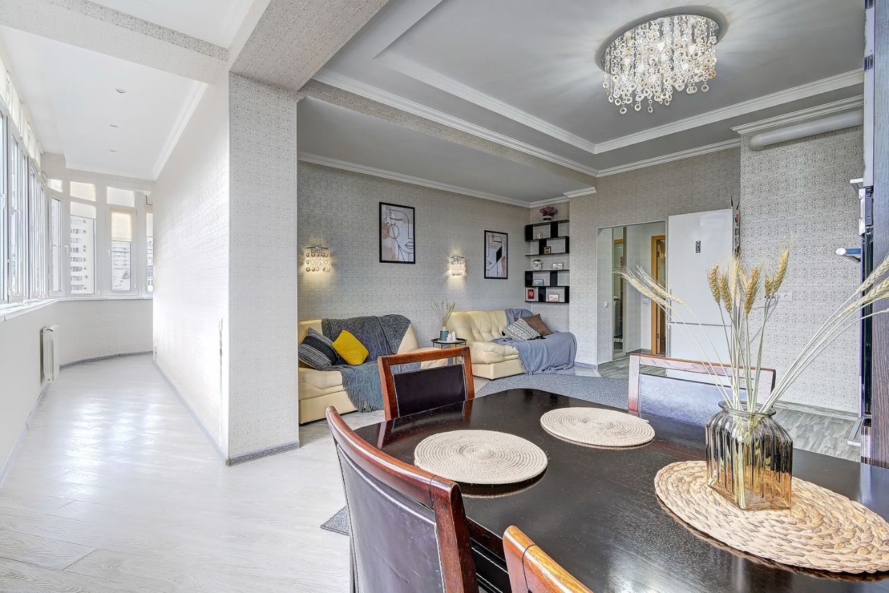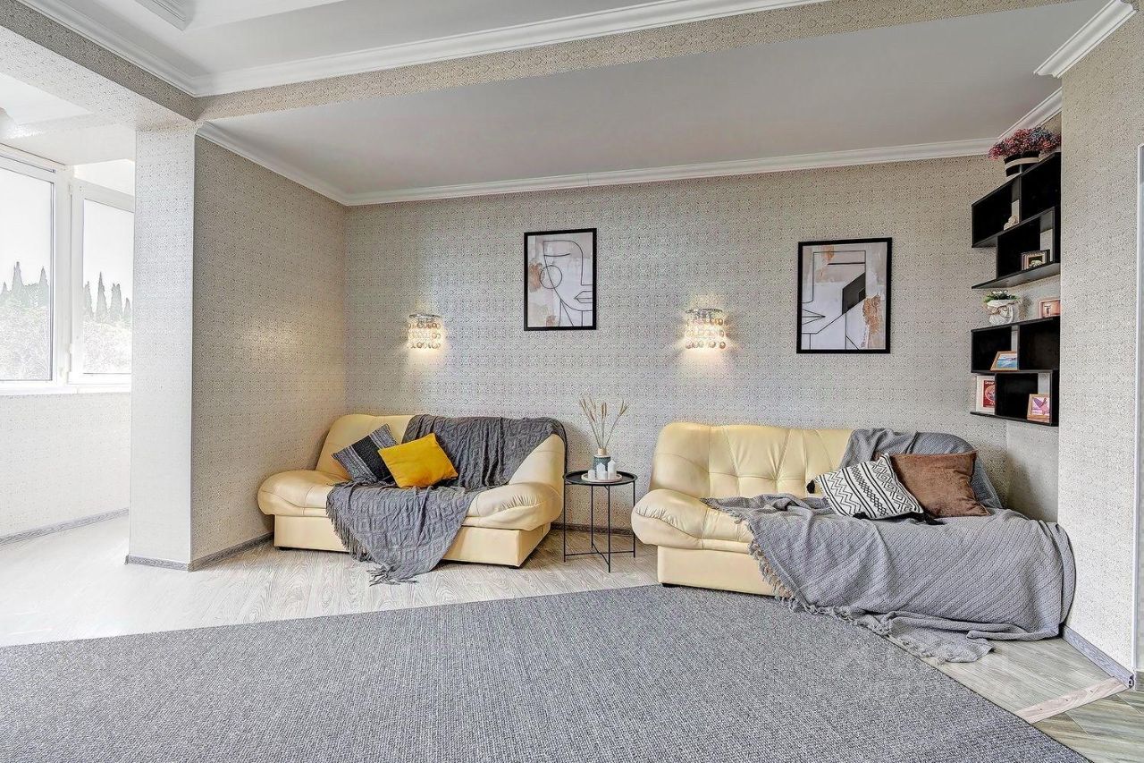 Квартира расположена у сан. Радуга, до моря 3 мин пешком. Вся инфраструктура в шаговой доступности. Квартира очень уютная, светлая, со всех окон панорамный вид на город и парковую зону.