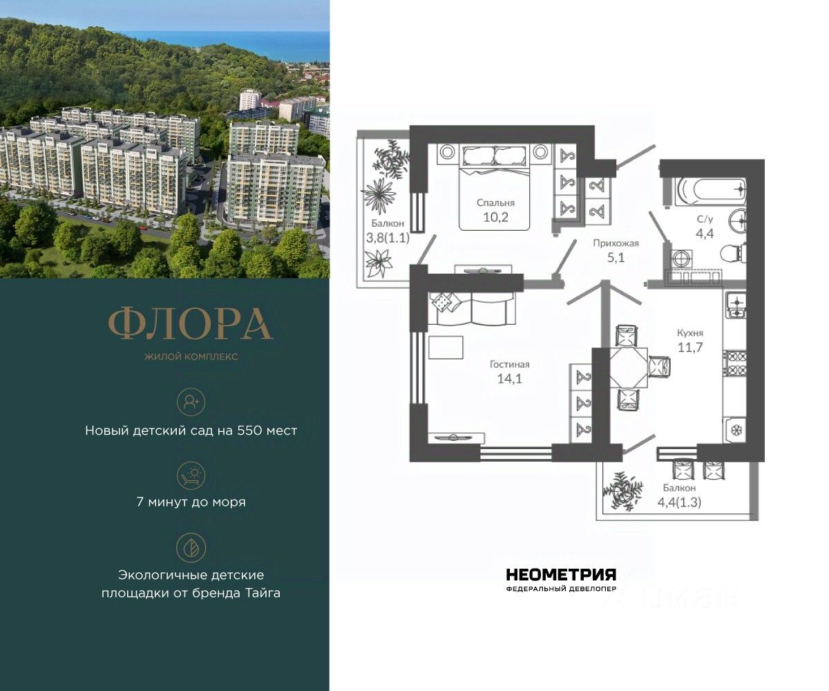 Продается квартира в ЖК "Флора" от федерального девелопера "Неометрия". Это жилой комплекс комфорт-класса в самом зеленом районе Сочи. При проектировании постарались максимально сохранить окружающую флору и фауну. Теплое море, горы, целебные источники, река, близость заповедника все это уже рядом с вами.