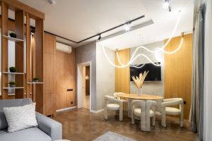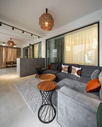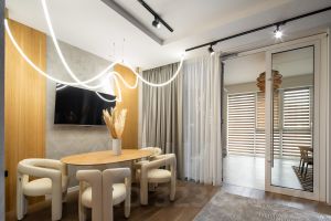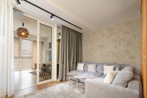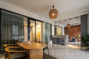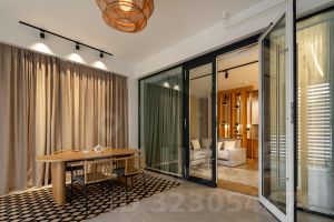 Квартира расположена в семи этажном доме на втором этаже и имеет следующую планировку: две полноценные спальни, кухня объединённая с гостиной, два санузла, гардеробные комнаты. А так же огромная закрытая терраса с зоной дивана, отдельным столом и барной стойкой с выходом на бассейн.