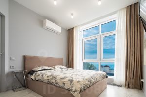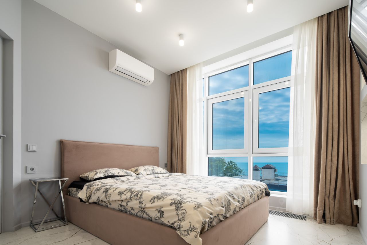 Отдельно выделенная спальня с двуспальной кроватью с панорамным окном и шикарным видом на море.