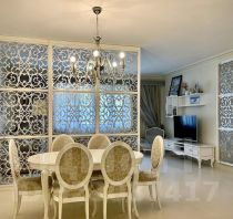 обеденная зона со столом на 6 персон, отделенная от гостиной ажурной перегородкой;