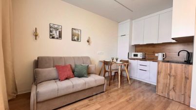 Продается уютная студия в современном жилом комплексе, построенном в 2021 году. Общая площадь квартиры составляет 22 кв. м, из которых 15 кв. м — жилая площадь и 6 кв. м — кухня. Квартира расположена на 10 этаже 19-этажного дома с высокими потолками, что добавляет простора и света.