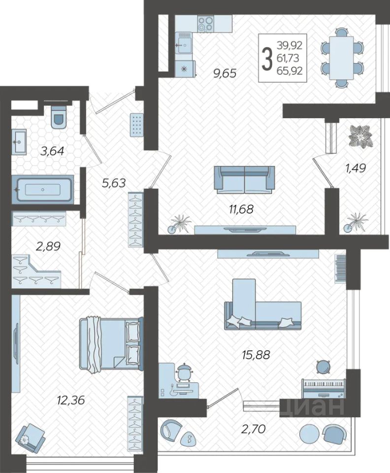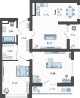 Застройщиком спроектированы одно-, двух- и трехкомнатные квартиры.