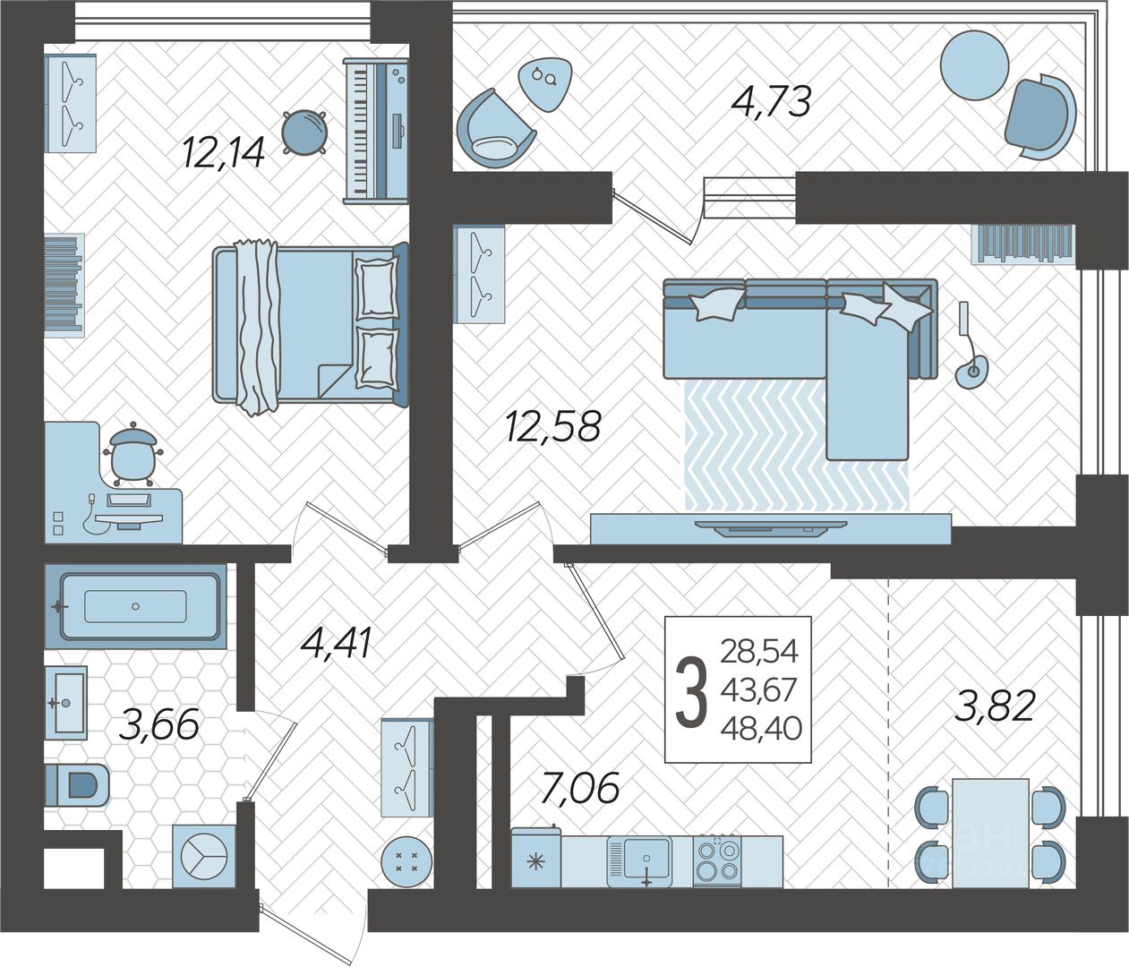 Застройщиком спроектированы одно-, двух- и трехкомнатные квартиры.