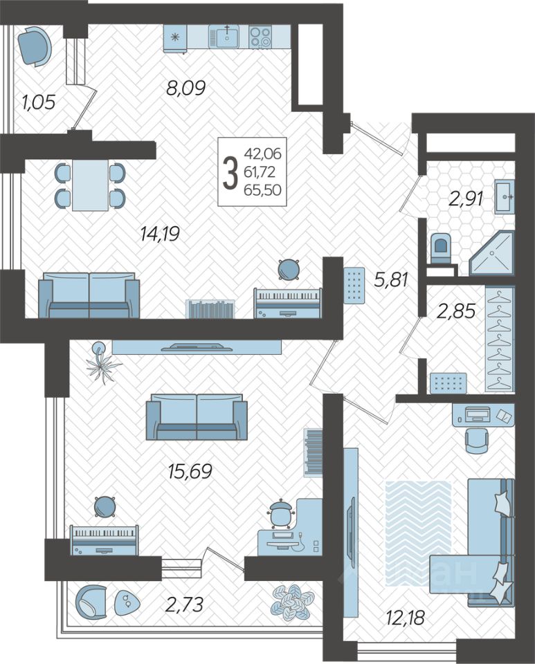 Застройщиком спроектированы одно-, двух- и трехкомнатные квартиры.