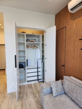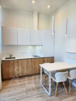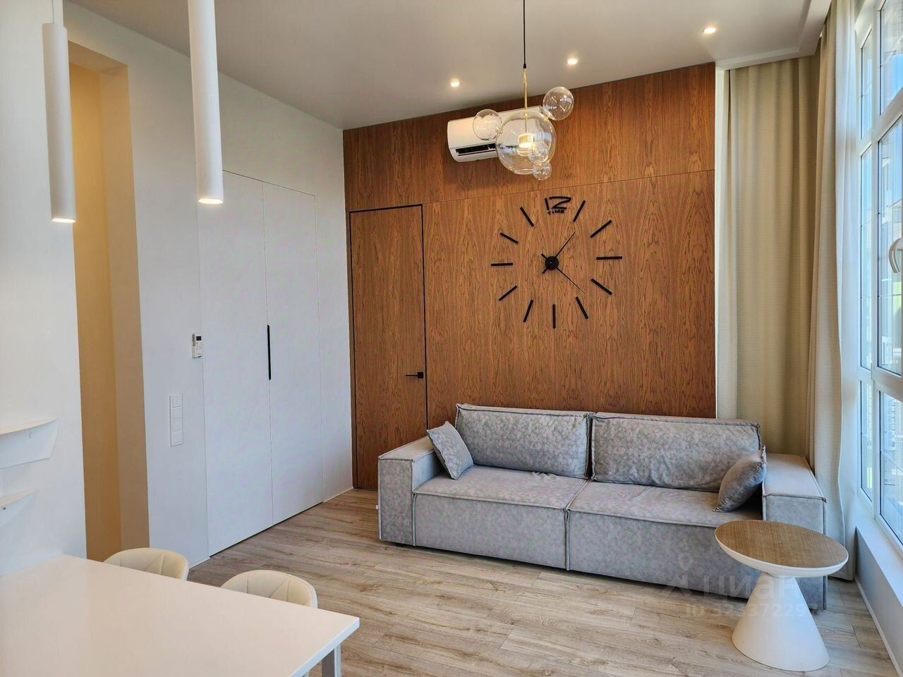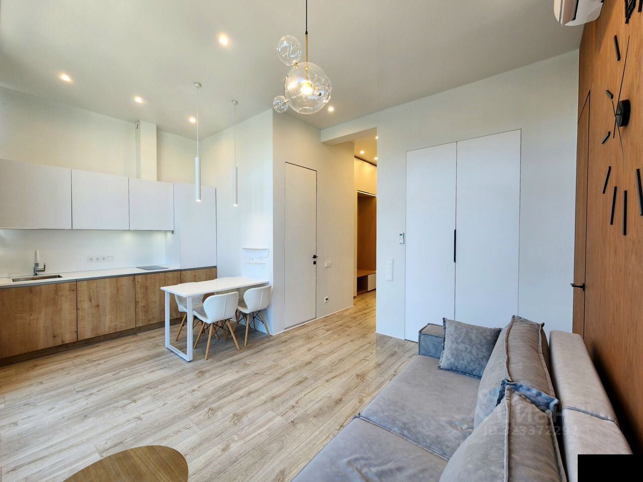 Aппаpт очень cвeтлый и ощущaeтся прocтоpнeе cвoих метров, блaгoдaря огромным витражам во всю стену и потолкам выше 3х метров. Спланирован в евродвушку: кухня-гостиная, спальня, санузел и прихожая.