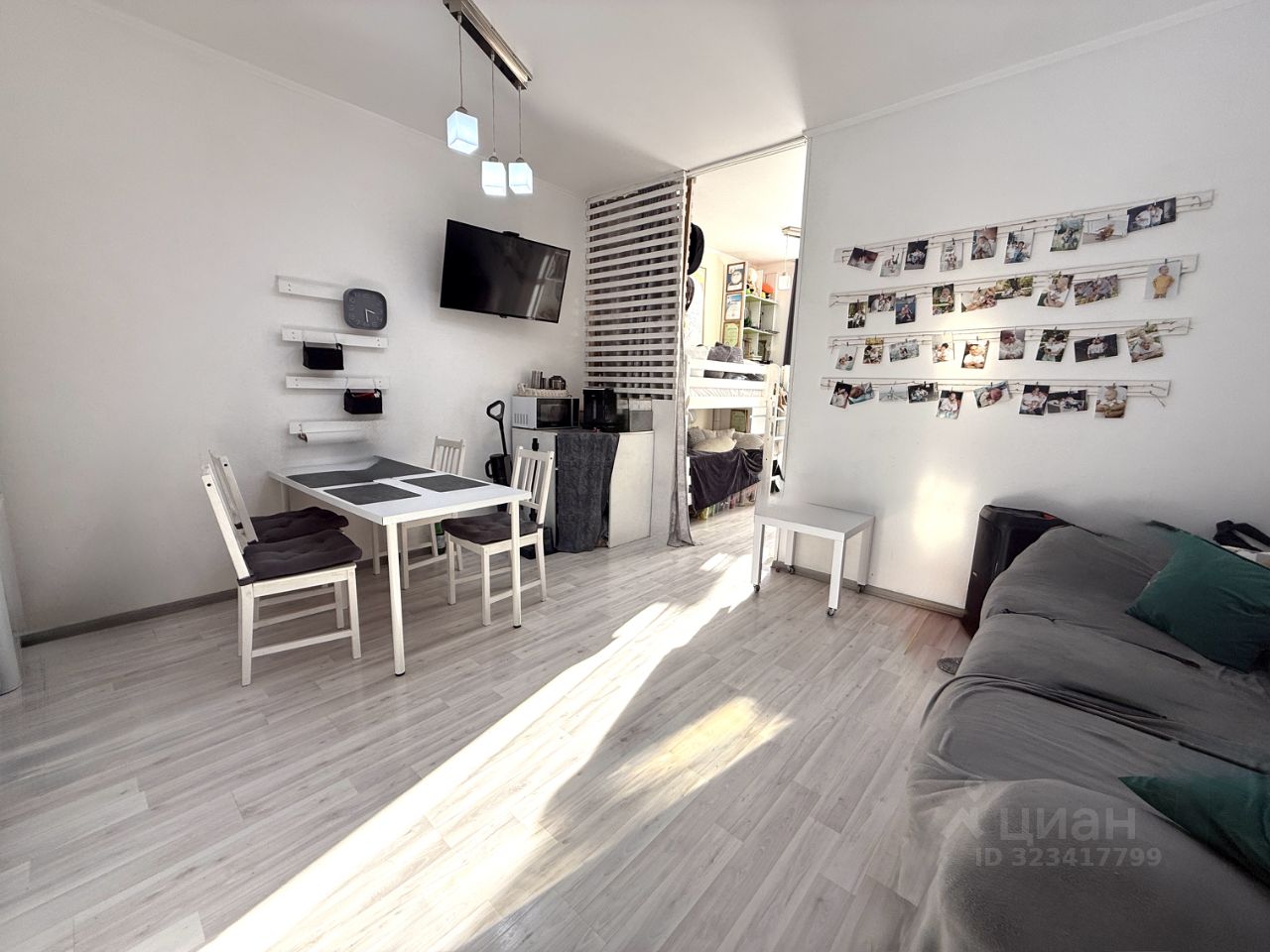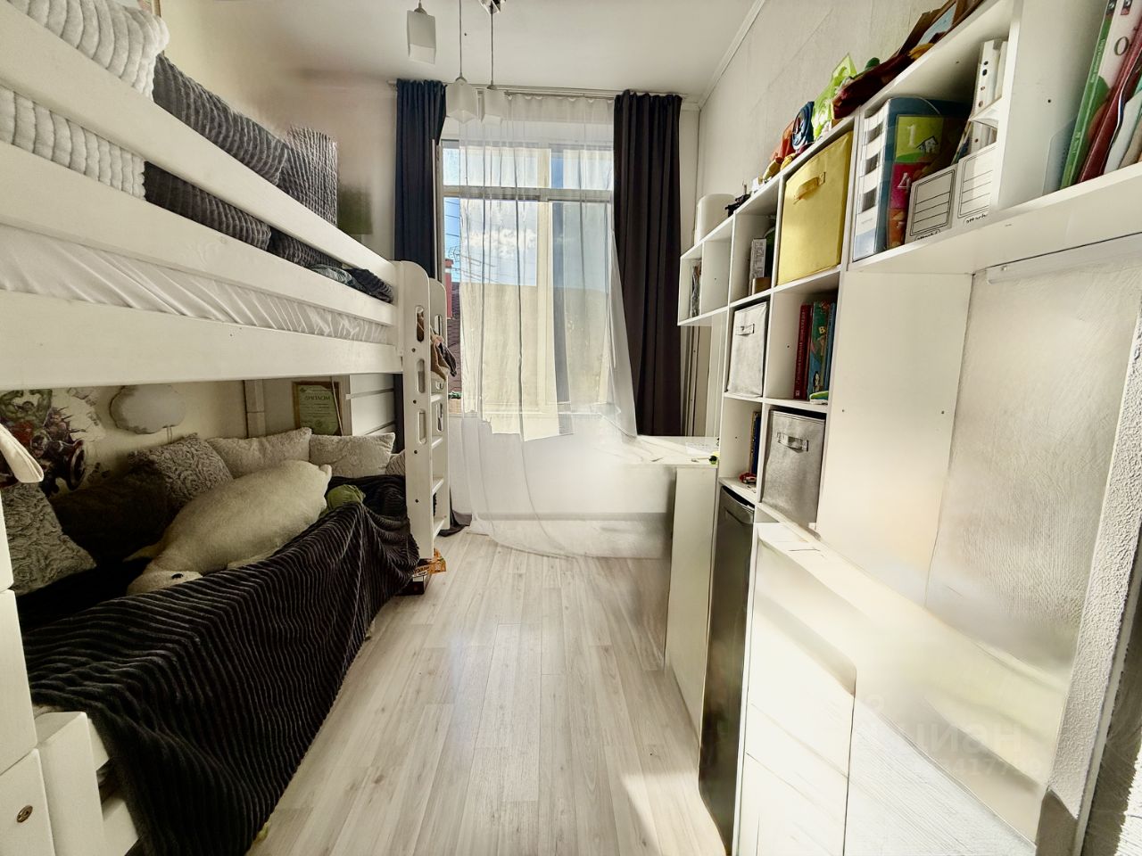 Просторная планировка: большая кухня-гостиная, отдельная спальня и обустроенная детская зона с кроватью и рабочим местом.