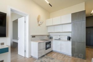 Интерьер квартиры выполнен в новом дизайнерском ремонте с использованием только высококачественных материалов. Установлена дорогая сантехника и мебель от ведущих международных брендов. Высота потолков достигает 4 метров, что позволяет создать уникальное пространство, например, организовать двухуровневую детскую комнату для трех детей.