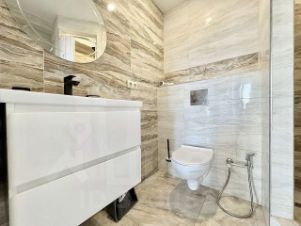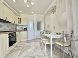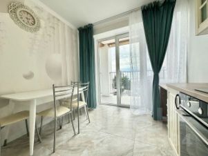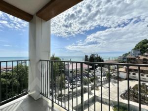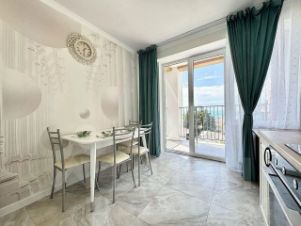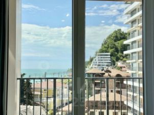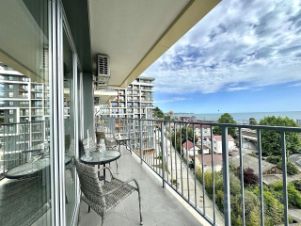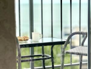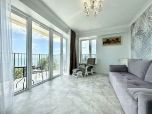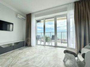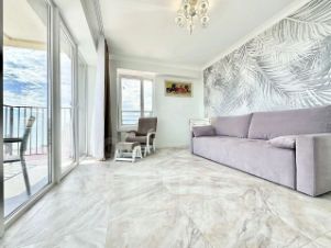 Светлая квартира на 7 этаже с дизайнерским ремонтом и всей необходимой техникой. Панорамные окна и балкон с прямым видом на море.