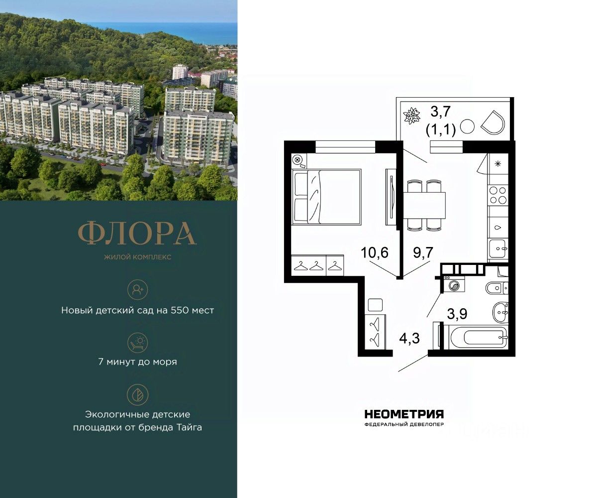 Продается квартира в ЖК "Флора" от федерального девелопера "Неометрия". Это жилой комплекс комфорт-класса в самом зеленом районе Сочи. При проектировании постарались максимально сохранить окружающую флору и фауну. Теплое море, горы, целебные источники, река, близость заповедника все это уже рядом с вами. Жилой комплекс "Флора" это: • 4,5 Га благоустроенной территории от дизайн-бюро Cora * 7 минут до моря на машине • Современные экологичные детские площадки от бренда "Тайга" • Яркие аллеи с цветниками и кустарниками для прогулок и утренних пробежек • Благоустроенная набережная с шезлонгами и перголами • Спортивные зоны для любителей пляжного волейбола, бадминтона и йоги - лапомоечные и колясочные в каждом подъезде - подземный паркинг на 429 мест Собственная управляющая компания с функцией "доверительного управления" Кудепста это прекрасный зеленый оазис, который расположился между историческим центром Сочи и Адлером. Благодаря выгодному местоположению ЖК "Флора" между курортным Адлером и центром Сочи до самых популярных социальных, культурных и развлекательных объектов города можно добраться за считанные минуты: Олимпийский парк. Красная Поляна, аэропорт, жд-вокзал. Кроме того, в шаговой доступности расположена вся необходимая социальная инфраструктура, что удобно для жизни всех членов семьи: • 2 школы; • 3 детских сада; • 3 поликлиники; • 2 фитнес-центра; • 3 магазина и гипермаркета; • спортивная школа • 2 остановки общественного транспорта. На первых этажах комплекса расположены коммерческие помещения пункты выдачи маркетплейсов, кофейни, магазины. В жилом комплексе соблюден принцип сбалансированных и эргономичных планировочных решений: от компактных студий до просторных семейных квартир. В каждой квартире есть балкон, и установлены увеличенные оконные рамы. На 12 этаже повышенной комфортности открываются потрясающие виды на море и национальный парк благодаря панорамному остеклению лоджий. Квартиру можно купить с черновой отделкой или с готовым ремонтом "Прайм", а также с сертификатом на покупку мебели. Приобрести квартиру можно за наличную оплату, в ипотеку, с привлечением средства маткапитала.