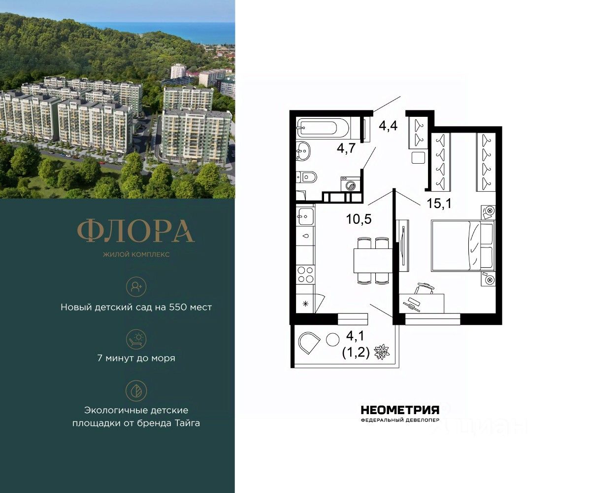 Продается квартира в ЖК "Флора" от федерального девелопера "Неометрия". Это жилой комплекс комфорт-класса в самом зеленом районе Сочи. При проектировании постарались максимально сохранить окружающую флору и фауну. Теплое море, горы, целебные источники, река, близость заповедника все это уже рядом с вами.