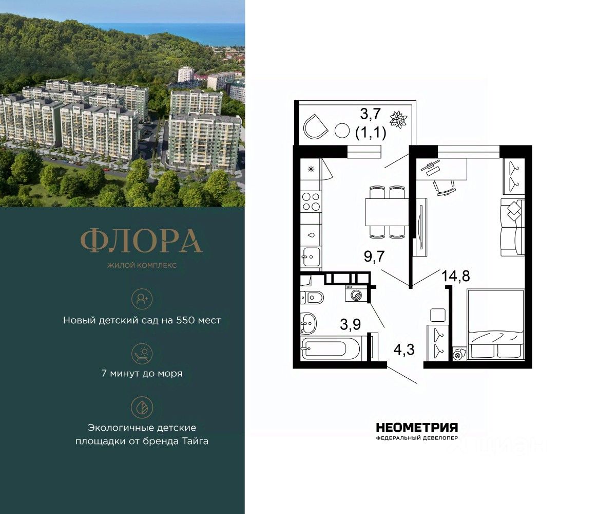 Продается квартира в ЖК "Флора" от федерального девелопера "Неометрия". Это жилой комплекс комфорт-класса в самом зеленом районе Сочи. При проектировании постарались максимально сохранить окружающую флору и фауну. Теплое море, горы, целебные источники, река, близость заповедника все это уже рядом с вами. Жилой комплекс "Флора" это: • 4,5 Га благоустроенной территории от дизайн-бюро Cora * 7 минут до моря на машине • Современные экологичные детские площадки от бренда "Тайга" • Яркие аллеи с цветниками и кустарниками для прогулок и утренних пробежек • Благоустроенная набережная с шезлонгами и перголами • Спортивные зоны для любителей пляжного волейбола, бадминтона и йоги - лапомоечные и колясочные в каждом подъезде - подземный паркинг на 429 мест Собственная управляющая компания с функцией "доверительного управления" Кудепста это прекрасный зеленый оазис, который расположился между историческим центром Сочи и Адлером. Благодаря выгодному местоположению ЖК "Флора" между курортным Адлером и центром Сочи до самых популярных социальных, культурных и развлекательных объектов города можно добраться за считанные минуты: Олимпийский парк. Красная Поляна, аэропорт, жд-вокзал. Кроме того, в шаговой доступности расположена вся необходимая социальная инфраструктура, что удобно для жизни всех членов семьи: • 2 школы; • 3 детских сада; • 3 поликлиники; • 2 фитнес-центра; • 3 магазина и гипермаркета; • спортивная школа • 2 остановки общественного транспорта. На первых этажах комплекса расположены коммерческие помещения пункты выдачи маркетплейсов, кофейни, магазины. В жилом комплексе соблюден принцип сбалансированных и эргономичных планировочных решений: от компактных студий до просторных семейных квартир. В каждой квартире есть балкон, и установлены увеличенные оконные рамы. На 12 этаже повышенной комфортности открываются потрясающие виды на море и национальный парк благодаря панорамному остеклению лоджий. Квартиру можно купить с черновой отделкой или с готовым ремонтом "Прайм", а также с сертификатом на покупку мебели. Приобрести квартиру можно за наличную оплату, в ипотеку, с привлечением средства маткапитала.