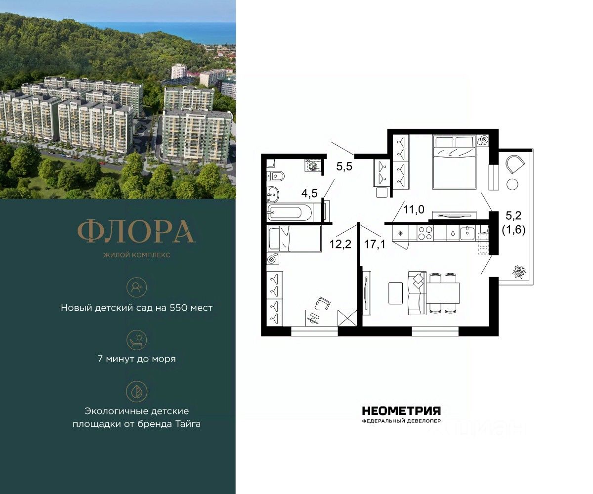 Продается квартира в ЖК "Флора" от федерального девелопера "Неометрия". Это жилой комплекс комфорт-класса в самом зеленом районе Сочи. При проектировании постарались максимально сохранить окружающую флору и фауну. Теплое море, горы, целебные источники, река, близость заповедника все это уже рядом с вами. Жилой комплекс "Флора" это: • 4,5 Га благоустроенной территории от дизайн-бюро Cora * 7 минут до моря на машине • Современные экологичные детские площадки от бренда "Тайга" • Яркие аллеи с цветниками и кустарниками для прогулок и утренних пробежек • Благоустроенная набережная с шезлонгами и перголами • Спортивные зоны для любителей пляжного волейбола, бадминтона и йоги - лапомоечные и колясочные в каждом подъезде - подземный паркинг на 429 мест Собственная управляющая компания с функцией "доверительного управления" Кудепста это прекрасный зеленый оазис, который расположился между историческим центром Сочи и Адлером. Благодаря выгодному местоположению ЖК "Флора" между курортным Адлером и центром Сочи до самых популярных социальных, культурных и развлекательных объектов города можно добраться за считанные минуты: Олимпийский парк. Красная Поляна, аэропорт, жд-вокзал. Кроме того, в шаговой доступности расположена вся необходимая социальная инфраструктура, что удобно для жизни всех членов семьи: • 2 школы; • 3 детских сада; • 3 поликлиники; • 2 фитнес-центра; • 3 магазина и гипермаркета; • спортивная школа • 2 остановки общественного транспорта. На первых этажах комплекса расположены коммерческие помещения пункты выдачи маркетплейсов, кофейни, магазины. В жилом комплексе соблюден принцип сбалансированных и эргономичных планировочных решений: от компактных студий до просторных семейных квартир. В каждой квартире есть балкон, и установлены увеличенные оконные рамы. На 12 этаже повышенной комфортности открываются потрясающие виды на море и национальный парк благодаря панорамному остеклению лоджий. Квартиру можно купить с черновой отделкой или с готовым ремонтом "Прайм", а также с сертификатом на покупку мебели. Приобрести квартиру можно за наличную оплату, в ипотеку, с привлечением средства маткапитала.