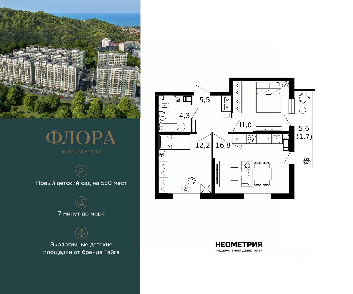 Продается квартира в ЖК "Флора" от федерального девелопера "Неометрия". Это жилой комплекс комфорт-класса в самом зеленом районе Сочи. При проектировании постарались максимально сохранить окружающую флору и фауну. Теплое море, горы, целебные источники, река, близость заповедника все это уже рядом с вами. Жилой комплекс "Флора" это: • 4,5 Га благоустроенной территории от дизайн-бюро Cora * 7 минут до моря на машине • Современные экологичные детские площадки от бренда "Тайга" • Яркие аллеи с цветниками и кустарниками для прогулок и утренних пробежек • Благоустроенная набережная с шезлонгами и перголами • Спортивные зоны для любителей пляжного волейбола, бадминтона и йоги - лапомоечные и колясочные в каждом подъезде - подземный паркинг на 429 мест Собственная управляющая компания с функцией "доверительного управления" Кудепста это прекрасный зеленый оазис, который расположился между историческим центром Сочи и Адлером. Благодаря выгодному местоположению ЖК "Флора" между курортным Адлером и центром Сочи до самых популярных социальных, культурных и развлекательных объектов города можно добраться за считанные минуты: Олимпийский парк. Красная Поляна, аэропорт, жд-вокзал. Кроме того, в шаговой доступности расположена вся необходимая социальная инфраструктура, что удобно для жизни всех членов семьи: • 2 школы; • 3 детских сада; • 3 поликлиники; • 2 фитнес-центра; • 3 магазина и гипермаркета; • спортивная школа • 2 остановки общественного транспорта. На первых этажах комплекса расположены коммерческие помещения пункты выдачи маркетплейсов, кофейни, магазины. В жилом комплексе соблюден принцип сбалансированных и эргономичных планировочных решений: от компактных студий до просторных семейных квартир. В каждой квартире есть балкон, и установлены увеличенные оконные рамы. На 12 этаже повышенной комфортности открываются потрясающие виды на море и национальный парк благодаря панорамному остеклению лоджий. Квартиру можно купить с черновой отделкой или с готовым ремонтом "Прайм", а также с сертификатом на покупку мебели. Приобрести квартиру можно за наличную оплату, в ипотеку, с привлечением средства маткапитала.