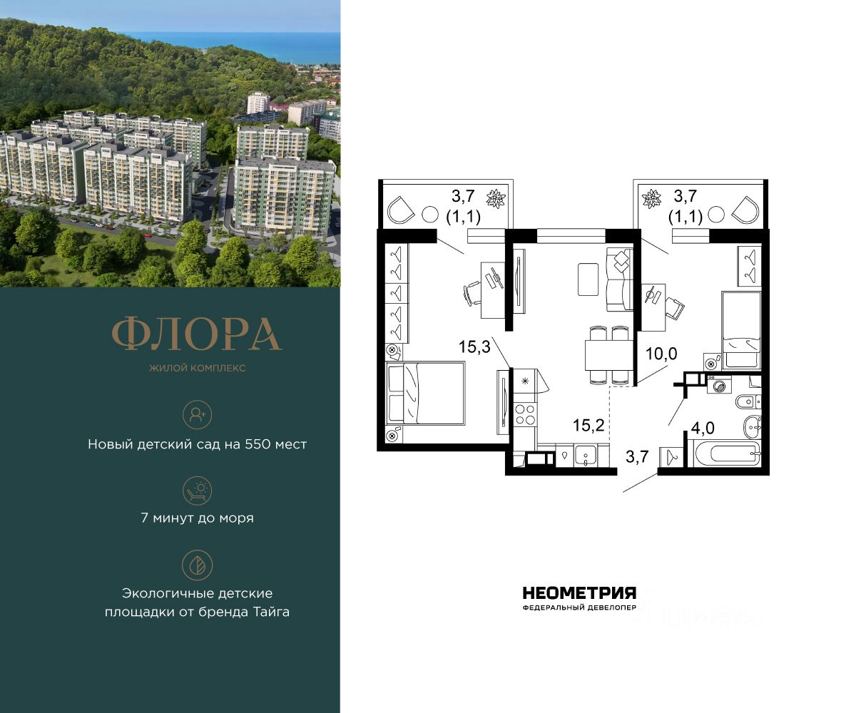 Продается квартира в ЖК "Флора" от федерального девелопера "Неометрия". Это жилой комплекс комфорт-класса в самом зеленом районе Сочи. При проектировании постарались максимально сохранить окружающую флору и фауну. Теплое море, горы, целебные источники, река, близость заповедника все это уже рядом с вами. Жилой комплекс "Флора" это: • 4,5 Га благоустроенной территории от дизайн-бюро Cora * 7 минут до моря на машине • Современные экологичные детские площадки от бренда "Тайга" • Яркие аллеи с цветниками и кустарниками для прогулок и утренних пробежек • Благоустроенная набережная с шезлонгами и перголами • Спортивные зоны для любителей пляжного волейбола, бадминтона и йоги - лапомоечные и колясочные в каждом подъезде - подземный паркинг на 429 мест Собственная управляющая компания с функцией "доверительного управления" Кудепста это прекрасный зеленый оазис, который расположился между историческим центром Сочи и Адлером. Благодаря выгодному местоположению ЖК "Флора" между курортным Адлером и центром Сочи до самых популярных социальных, культурных и развлекательных объектов города можно добраться за считанные минуты: Олимпийский парк. Красная Поляна, аэропорт, жд-вокзал. Кроме того, в шаговой доступности расположена вся необходимая социальная инфраструктура, что удобно для жизни всех членов семьи: • 2 школы; • 3 детских сада; • 3 поликлиники; • 2 фитнес-центра; • 3 магазина и гипермаркета; • спортивная школа • 2 остановки общественного транспорта. На первых этажах комплекса расположены коммерческие помещения пункты выдачи маркетплейсов, кофейни, магазины. В жилом комплексе соблюден принцип сбалансированных и эргономичных планировочных решений: от компактных студий до просторных семейных квартир. В каждой квартире есть балкон, и установлены увеличенные оконные рамы. На 12 этаже повышенной комфортности открываются потрясающие виды на море и национальный парк благодаря панорамному остеклению лоджий. Квартиру можно купить с черновой отделкой или с готовым ремонтом "Прайм", а также с сертификатом на покупку мебели. Приобрести квартиру можно за наличную оплату, в ипотеку, с привлечением средства маткапитала.