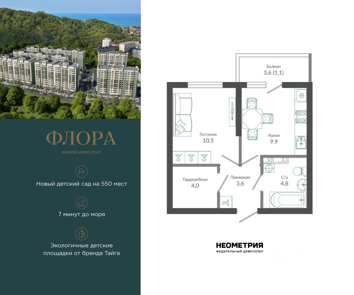 Продается квартира в ЖК "Флора" от федерального девелопера "Неометрия". Это жилой комплекс комфорт-класса в самом зеленом районе Сочи. При проектировании постарались максимально сохранить окружающую флору и фауну. Теплое море, горы, целебные источники, река, близость заповедника все это уже рядом с вами. Жилой комплекс "Флора" это: • 4,5 Га благоустроенной территории от дизайн-бюро Cora * 7 минут до моря на машине • Современные экологичные детские площадки от бренда "Тайга" • Яркие аллеи с цветниками и кустарниками для прогулок и утренних пробежек • Благоустроенная набережная с шезлонгами и перголами • Спортивные зоны для любителей пляжного волейбола, бадминтона и йоги - лапомоечные и колясочные в каждом подъезде - подземный паркинг на 429 мест Собственная управляющая компания с функцией "доверительного управления" Кудепста это прекрасный зеленый оазис, который расположился между историческим центром Сочи и Адлером. Благодаря выгодному местоположению ЖК "Флора" между курортным Адлером и центром Сочи до самых популярных социальных, культурных и развлекательных объектов города можно добраться за считанные минуты: Олимпийский парк. Красная Поляна, аэропорт, жд-вокзал. Кроме того, в шаговой доступности расположена вся необходимая социальная инфраструктура, что удобно для жизни всех членов семьи: • 2 школы; • 3 детских сада; • 3 поликлиники; • 2 фитнес-центра; • 3 магазина и гипермаркета; • спортивная школа • 2 остановки общественного транспорта. На первых этажах комплекса расположены коммерческие помещения пункты выдачи маркетплейсов, кофейни, магазины. В жилом комплексе соблюден принцип сбалансированных и эргономичных планировочных решений: от компактных студий до просторных семейных квартир. В каждой квартире есть балкон, и установлены увеличенные оконные рамы. На 12 этаже повышенной комфортности открываются потрясающие виды на море и национальный парк благодаря панорамному остеклению лоджий. Квартиру можно купить с черновой отделкой или с готовым ремонтом "Прайм", а также с сертификатом на покупку мебели. Приобрести квартиру можно за наличную оплату, в ипотеку, с привлечением средства маткапитала.