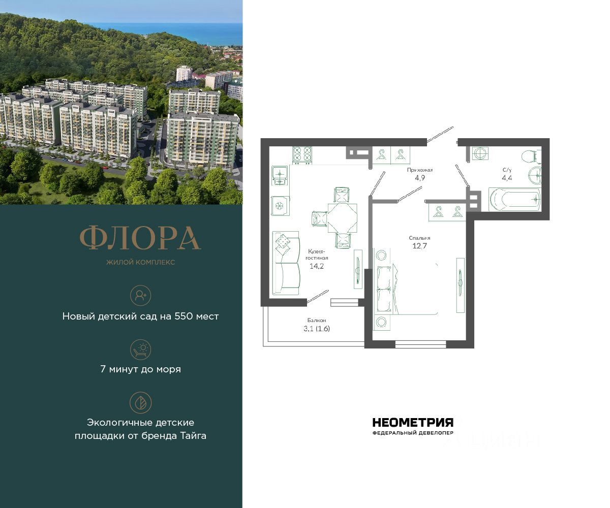 Продается квартира в ЖК "Флора" от федерального девелопера "Неометрия". Это жилой комплекс комфорт-класса в самом зеленом районе Сочи. При проектировании постарались максимально сохранить окружающую флору и фауну. Теплое море, горы, целебные источники, река, близость заповедника все это уже рядом с вами. Жилой комплекс "Флора" это: • 4,5 Га благоустроенной территории от дизайн-бюро Cora * 7 минут до моря на машине • Современные экологичные детские площадки от бренда "Тайга" • Яркие аллеи с цветниками и кустарниками для прогулок и утренних пробежек • Благоустроенная набережная с шезлонгами и перголами • Спортивные зоны для любителей пляжного волейбола, бадминтона и йоги - лапомоечные и колясочные в каждом подъезде - подземный паркинг на 429 мест Собственная управляющая компания с функцией "доверительного управления" Кудепста это прекрасный зеленый оазис, который расположился между историческим центром Сочи и Адлером. Благодаря выгодному местоположению ЖК "Флора" между курортным Адлером и центром Сочи до самых популярных социальных, культурных и развлекательных объектов города можно добраться за считанные минуты: Олимпийский парк. Красная Поляна, аэропорт, жд-вокзал. Кроме того, в шаговой доступности расположена вся необходимая социальная инфраструктура, что удобно для жизни всех членов семьи: • 2 школы; • 3 детских сада; • 3 поликлиники; • 2 фитнес-центра; • 3 магазина и гипермаркета; • спортивная школа • 2 остановки общественного транспорта. На первых этажах комплекса расположены коммерческие помещения пункты выдачи маркетплейсов, кофейни, магазины. В жилом комплексе соблюден принцип сбалансированных и эргономичных планировочных решений: от компактных студий до просторных семейных квартир. В каждой квартире есть балкон, и установлены увеличенные оконные рамы. На 12 этаже повышенной комфортности открываются потрясающие виды на море и национальный парк благодаря панорамному остеклению лоджий. Квартиру можно купить с черновой отделкой или с готовым ремонтом "Прайм", а также с сертификатом на покупку мебели. Приобрести квартиру можно за наличную оплату, в ипотеку, с привлечением средства маткапитала.