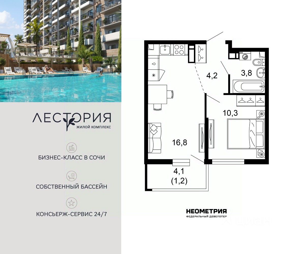 Продается квартира в жилом комплексе бизнес-класса "Лестория". В составе ЖК предусмотрена собственная аквазона площадью 473 квадратных метра с двумя подогреваемыми бассейнами, что соответствуют стандартам бизнес-класса. Аквазона объединяет взрослый и детский бассейны. В welcome-zone к услугам посетителей шезлонги и все необходимые принадлежности. Раздевалки с душевыми комнатами, инфракрасная сауна — здесь все предусмотрено для комфортного отдыха и полного расслабления. Для водного комплекса продуман отдельный вход, оборудованный системой контроля и управления доступом (СКУД). Аквазона только часть уникальной инфраструктуры "Лестории", которая включает в себя также благоустроенную территорию с пятьюдесятью функциональными зонами для прогулок, отдыха и занятий спортом, видовые террасы на крышах для отдыха, работы и встреч с друзьями, а также пространство набережной Кудепсты с шезлонгами и перголами. Жилой комплекс "Лестория" состоит из шести домов высотностью от 15 до 17 этажей, окружённых зеленым массивом национального парка. На придомовой территории для жителей предусмотрены закрытые дворы с круглосуточным видеонаблюдением, активити-центр для детей и подростков, тихие зоны для отдыха и медитации. На крышах домов будут созданы зеленые террасы для наслаждения прекрасными видами на море и горы. В проекте предусмотрены разные варианты отделки квартир под потребности покупателей. Тем, кто хочет воплотить в жизнь собственные интерьерные задумки, подойдут квартиры без ремонта. Для комфортной жизни и отдыха в комплексе будет работать круглосуточный консьерж-сервис уровня 5*, который с легкостью закроет все ежедневные потребности: от заказа продуктов и встречи гостей в аэропорту до выгула и дрессировки питомца. К услугам жителей ЖК "Лестория" — собственная управляющая компания, для инвесторов предоставляются услуги доверительного управления.