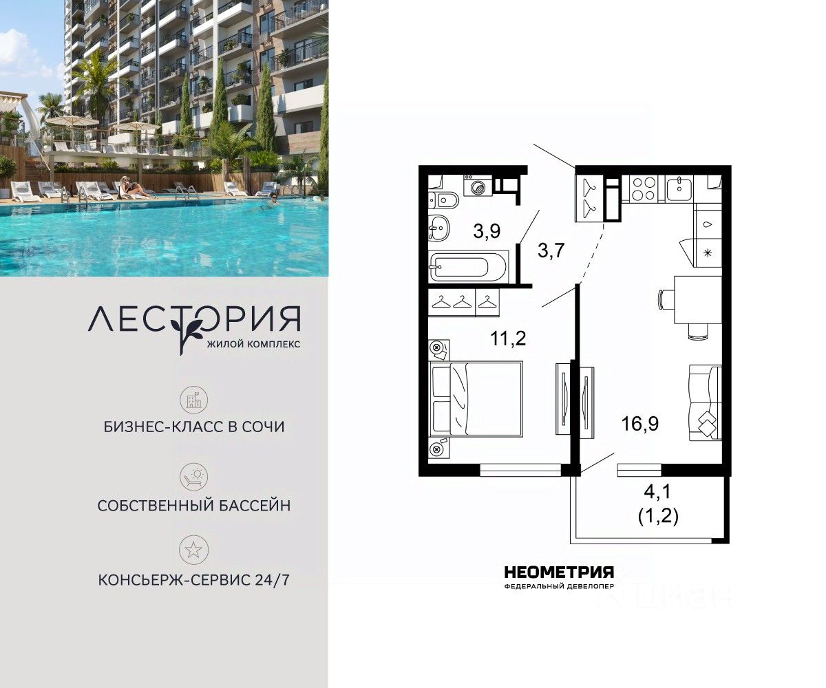 Продается квартира в жилом комплексе бизнес-класса "Лестория". В составе ЖК предусмотрена собственная аквазона площадью 473 квадратных метра с двумя подогреваемыми бассейнами, что соответствуют стандартам бизнес-класса. Аквазона объединяет взрослый и детский бассейны. В welcome-zone к услугам посетителей шезлонги и все необходимые принадлежности. Раздевалки с душевыми комнатами, инфракрасная сауна — здесь все предусмотрено для комфортного отдыха и полного расслабления. Для водного комплекса продуман отдельный вход, оборудованный системой контроля и управления доступом (СКУД). Аквазона только часть уникальной инфраструктуры "Лестории", которая включает в себя также благоустроенную территорию с пятьюдесятью функциональными зонами для прогулок, отдыха и занятий спортом, видовые террасы на крышах для отдыха, работы и встреч с друзьями, а также пространство набережной Кудепсты с шезлонгами и перголами. Жилой комплекс "Лестория" состоит из шести домов высотностью от 15 до 17 этажей, окружённых зеленым массивом национального парка. На придомовой территории для жителей предусмотрены закрытые дворы с круглосуточным видеонаблюдением, активити-центр для детей и подростков, тихие зоны для отдыха и медитации. На крышах домов будут созданы зеленые террасы для наслаждения прекрасными видами на море и горы. В проекте предусмотрены разные варианты отделки квартир под потребности покупателей. Тем, кто хочет воплотить в жизнь собственные интерьерные задумки, подойдут квартиры без ремонта. Для комфортной жизни и отдыха в комплексе будет работать круглосуточный консьерж-сервис уровня 5*, который с легкостью закроет все ежедневные потребности: от заказа продуктов и встречи гостей в аэропорту до выгула и дрессировки питомца. К услугам жителей ЖК "Лестория" — собственная управляющая компания, для инвесторов предоставляются услуги доверительного управления.