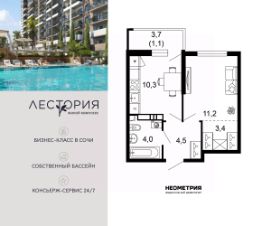 Продается квартира в жилом комплексе бизнес-класса "Лестория". В составе ЖК предусмотрена собственная аквазона площадью 473 квадратных метра с двумя подогреваемыми бассейнами, что соответствуют стандартам бизнес-класса. Аквазона объединяет взрослый и детский бассейны. В welcome-zone к услугам посетителей шезлонги и все необходимые принадлежности. Раздевалки с душевыми комнатами, инфракрасная сауна — здесь все предусмотрено для комфортного отдыха и полного расслабления. Для водного комплекса продуман отдельный вход, оборудованный системой контроля и управления доступом (СКУД). Аквазона только часть уникальной инфраструктуры "Лестории", которая включает в себя также благоустроенную территорию с пятьюдесятью функциональными зонами для прогулок, отдыха и занятий спортом, видовые террасы на крышах для отдыха, работы и встреч с друзьями, а также пространство набережной Кудепсты с шезлонгами и перголами. Жилой комплекс "Лестория" состоит из шести домов высотностью от 15 до 17 этажей, окружённых зеленым массивом национального парка. На придомовой территории для жителей предусмотрены закрытые дворы с круглосуточным видеонаблюдением, активити-центр для детей и подростков, тихие зоны для отдыха и медитации. На крышах домов будут созданы зеленые террасы для наслаждения прекрасными видами на море и горы. В проекте предусмотрены разные варианты отделки квартир под потребности покупателей. Тем, кто хочет воплотить в жизнь собственные интерьерные задумки, подойдут квартиры без ремонта. Для комфортной жизни и отдыха в комплексе будет работать круглосуточный консьерж-сервис уровня 5*, который с легкостью закроет все ежедневные потребности: от заказа продуктов и встречи гостей в аэропорту до выгула и дрессировки питомца. К услугам жителей ЖК "Лестория" — собственная управляющая компания, для инвесторов предоставляются услуги доверительного управления.