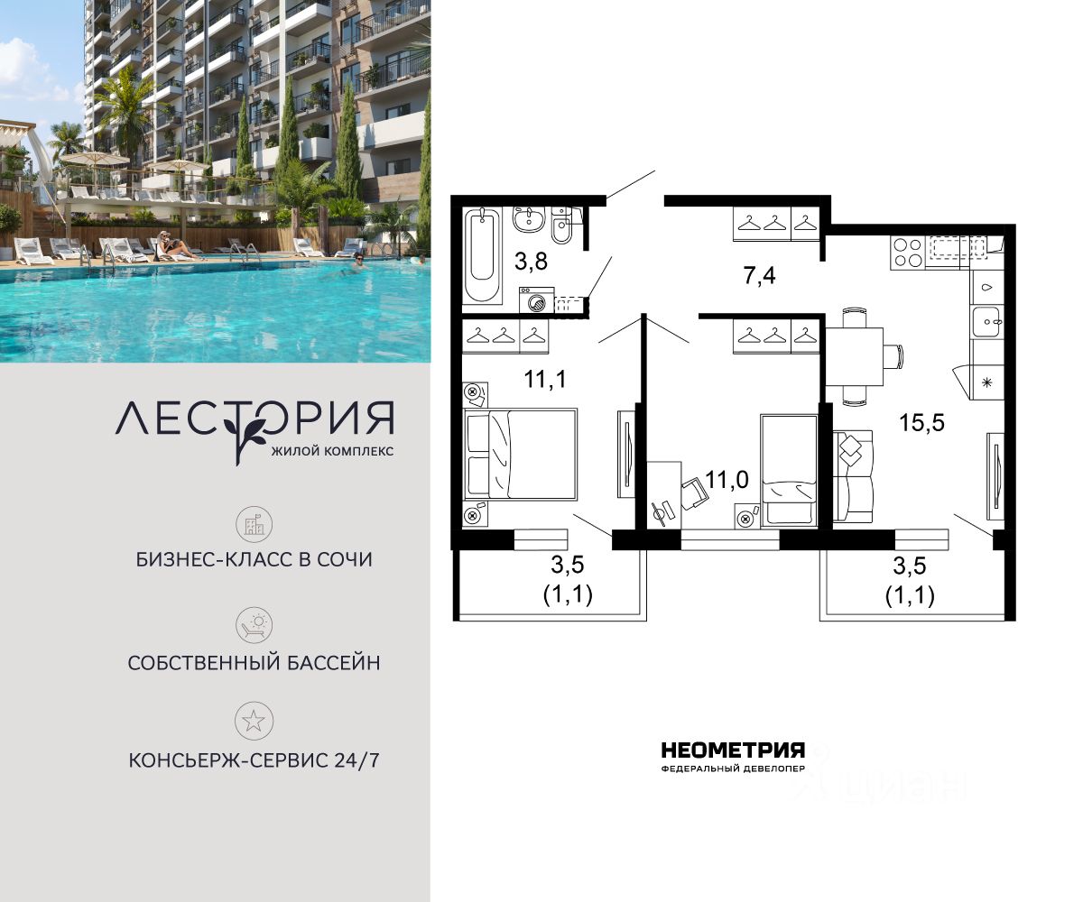 Продается квартира в жилом комплексе бизнес-класса "Лестория". В составе ЖК предусмотрена собственная аквазона площадью 473 квадратных метра с двумя подогреваемыми бассейнами, что соответствуют стандартам бизнес-класса. Аквазона объединяет взрослый и детский бассейны. В welcome-zone к услугам посетителей шезлонги и все необходимые принадлежности. Раздевалки с душевыми комнатами, инфракрасная сауна — здесь все предусмотрено для комфортного отдыха и полного расслабления. Для водного комплекса продуман отдельный вход, оборудованный системой контроля и управления доступом (СКУД). Аквазона только часть уникальной инфраструктуры "Лестории", которая включает в себя также благоустроенную территорию с пятьюдесятью функциональными зонами для прогулок, отдыха и занятий спортом, видовые террасы на крышах для отдыха, работы и встреч с друзьями, а также пространство набережной Кудепсты с шезлонгами и перголами. Жилой комплекс "Лестория" состоит из шести домов высотностью от 15 до 17 этажей, окружённых зеленым массивом национального парка. На придомовой территории для жителей предусмотрены закрытые дворы с круглосуточным видеонаблюдением, активити-центр для детей и подростков, тихие зоны для отдыха и медитации. На крышах домов будут созданы зеленые террасы для наслаждения прекрасными видами на море и горы. В проекте предусмотрены разные варианты отделки квартир под потребности покупателей. Тем, кто хочет воплотить в жизнь собственные интерьерные задумки, подойдут квартиры без ремонта. Для комфортной жизни и отдыха в комплексе будет работать круглосуточный консьерж-сервис уровня 5*, который с легкостью закроет все ежедневные потребности: от заказа продуктов и встречи гостей в аэропорту до выгула и дрессировки питомца. К услугам жителей ЖК "Лестория" — собственная управляющая компания, для инвесторов предоставляются услуги доверительного управления.