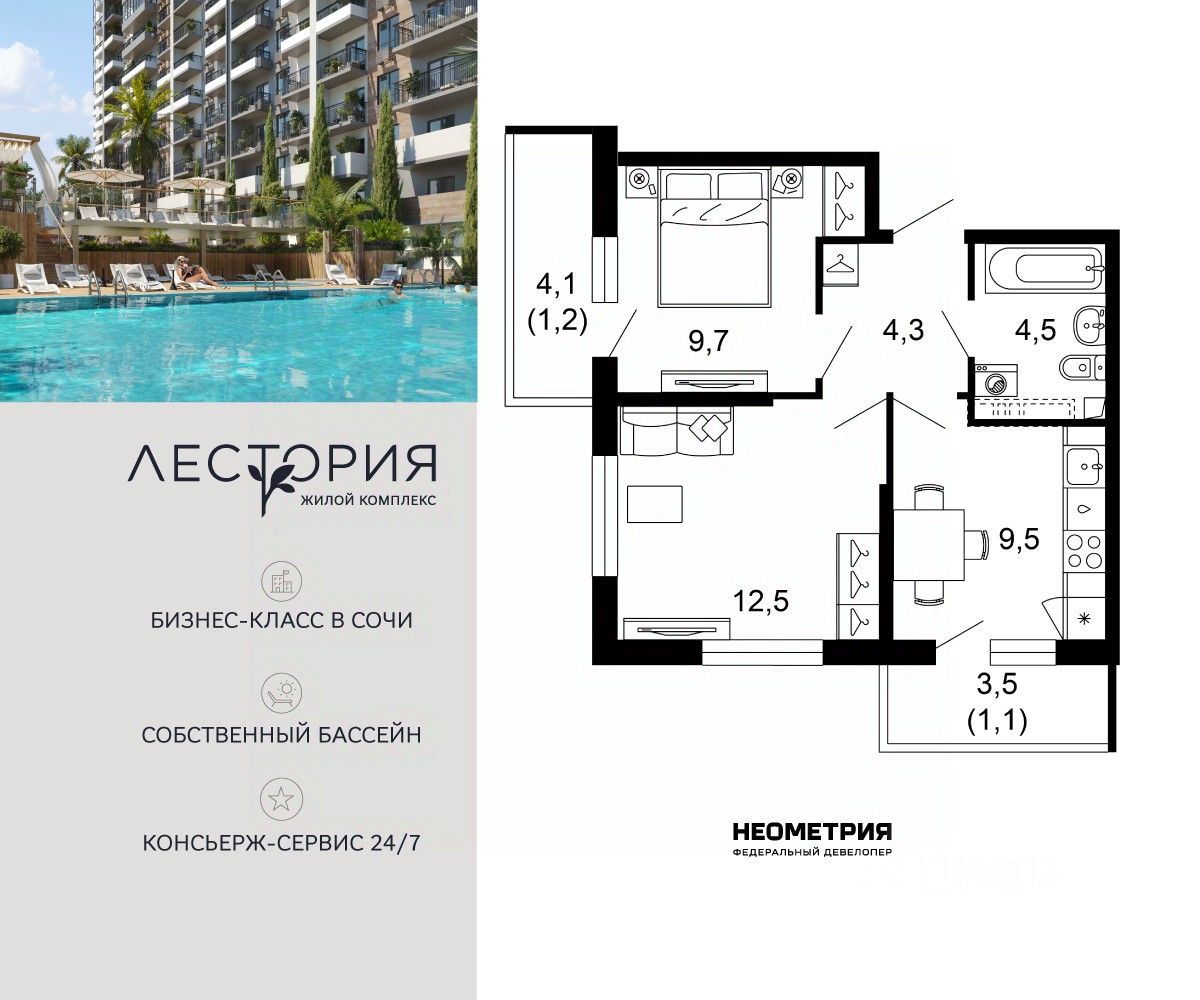Продается квартира в жилом комплексе бизнес-класса "Лестория". В составе ЖК предусмотрена собственная аквазона площадью 473 квадратных метра с двумя подогреваемыми бассейнами, что соответствуют стандартам бизнес-класса. Аквазона объединяет взрослый и детский бассейны. В welcome-zone к услугам посетителей шезлонги и все необходимые принадлежности. Раздевалки с душевыми комнатами, инфракрасная сауна — здесь все предусмотрено для комфортного отдыха и полного расслабления. Для водного комплекса продуман отдельный вход, оборудованный системой контроля и управления доступом (СКУД). Аквазона только часть уникальной инфраструктуры "Лестории", которая включает в себя также благоустроенную территорию с пятьюдесятью функциональными зонами для прогулок, отдыха и занятий спортом, видовые террасы на крышах для отдыха, работы и встреч с друзьями, а также пространство набережной Кудепсты с шезлонгами и перголами. Жилой комплекс "Лестория" состоит из шести домов высотностью от 15 до 17 этажей, окружённых зеленым массивом национального парка. На придомовой территории для жителей предусмотрены закрытые дворы с круглосуточным видеонаблюдением, активити-центр для детей и подростков, тихие зоны для отдыха и медитации. На крышах домов будут созданы зеленые террасы для наслаждения прекрасными видами на море и горы. В проекте предусмотрены разные варианты отделки квартир под потребности покупателей. Тем, кто хочет воплотить в жизнь собственные интерьерные задумки, подойдут квартиры без ремонта. Для комфортной жизни и отдыха в комплексе будет работать круглосуточный консьерж-сервис уровня 5*, который с легкостью закроет все ежедневные потребности: от заказа продуктов и встречи гостей в аэропорту до выгула и дрессировки питомца. К услугам жителей ЖК "Лестория" — собственная управляющая компания, для инвесторов предоставляются услуги доверительного управления.