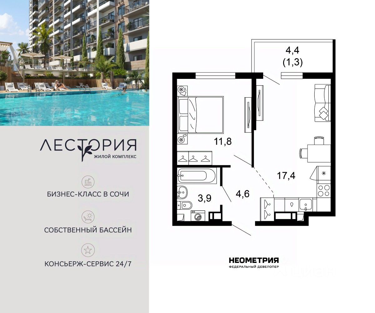 Продается квартира в жилом комплексе бизнес-класса "Лестория". В составе ЖК предусмотрена собственная аквазона площадью 473 квадратных метра с двумя подогреваемыми бассейнами, что соответствуют стандартам бизнес-класса. Аквазона объединяет взрослый и детский бассейны. В welcome-zone к услугам посетителей шезлонги и все необходимые принадлежности. Раздевалки с душевыми комнатами, инфракрасная сауна — здесь все предусмотрено для комфортного отдыха и полного расслабления. Для водного комплекса продуман отдельный вход, оборудованный системой контроля и управления доступом (СКУД). Аквазона только часть уникальной инфраструктуры "Лестории", которая включает в себя также благоустроенную территорию с пятьюдесятью функциональными зонами для прогулок, отдыха и занятий спортом, видовые террасы на крышах для отдыха, работы и встреч с друзьями, а также пространство набережной Кудепсты с шезлонгами и перголами. Жилой комплекс "Лестория" состоит из шести домов высотностью от 15 до 17 этажей, окружённых зеленым массивом национального парка. На придомовой территории для жителей предусмотрены закрытые дворы с круглосуточным видеонаблюдением, активити-центр для детей и подростков, тихие зоны для отдыха и медитации. На крышах домов будут созданы зеленые террасы для наслаждения прекрасными видами на море и горы. В проекте предусмотрены разные варианты отделки квартир под потребности покупателей. Тем, кто хочет воплотить в жизнь собственные интерьерные задумки, подойдут квартиры без ремонта. Для комфортной жизни и отдыха в комплексе будет работать круглосуточный консьерж-сервис уровня 5*, который с легкостью закроет все ежедневные потребности: от заказа продуктов и встречи гостей в аэропорту до выгула и дрессировки питомца. К услугам жителей ЖК "Лестория" — собственная управляющая компания, для инвесторов предоставляются услуги доверительного управления.