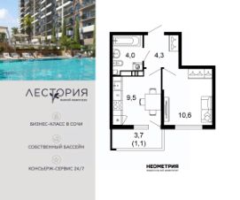 Продается квартира в жилом комплексе бизнес-класса "Лестория". В составе ЖК предусмотрена собственная аквазона площадью 473 квадратных метра с двумя подогреваемыми бассейнами, что соответствуют стандартам бизнес-класса. Аквазона объединяет взрослый и детский бассейны. В welcome-zone к услугам посетителей шезлонги и все необходимые принадлежности. Раздевалки с душевыми комнатами, инфракрасная сауна — здесь все предусмотрено для комфортного отдыха и полного расслабления. Для водного комплекса продуман отдельный вход, оборудованный системой контроля и управления доступом (СКУД). Аквазона только часть уникальной инфраструктуры "Лестории", которая включает в себя также благоустроенную территорию с пятьюдесятью функциональными зонами для прогулок, отдыха и занятий спортом, видовые террасы на крышах для отдыха, работы и встреч с друзьями, а также пространство набережной Кудепсты с шезлонгами и перголами. Жилой комплекс "Лестория" состоит из шести домов высотностью от 15 до 17 этажей, окружённых зеленым массивом национального парка. На придомовой территории для жителей предусмотрены закрытые дворы с круглосуточным видеонаблюдением, активити-центр для детей и подростков, тихие зоны для отдыха и медитации. На крышах домов будут созданы зеленые террасы для наслаждения прекрасными видами на море и горы. В проекте предусмотрены разные варианты отделки квартир под потребности покупателей. Тем, кто хочет воплотить в жизнь собственные интерьерные задумки, подойдут квартиры без ремонта. Для комфортной жизни и отдыха в комплексе будет работать круглосуточный консьерж-сервис уровня 5*, который с легкостью закроет все ежедневные потребности: от заказа продуктов и встречи гостей в аэропорту до выгула и дрессировки питомца. К услугам жителей ЖК "Лестория" — собственная управляющая компания, для инвесторов предоставляются услуги доверительного управления.