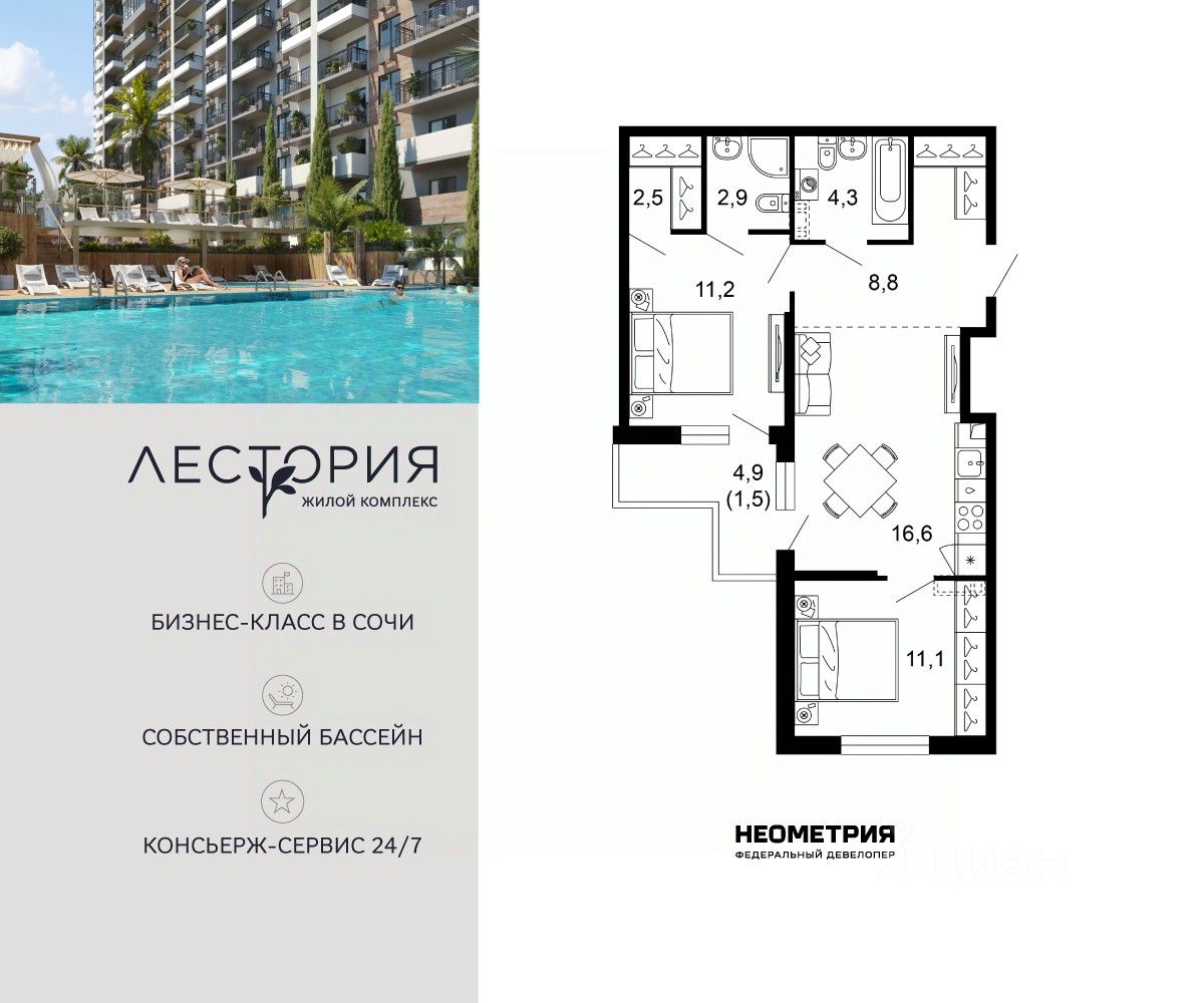 Продается квартира в жилом комплексе бизнес-класса "Лестория". В составе ЖК предусмотрена собственная аквазона площадью 473 квадратных метра с двумя подогреваемыми бассейнами, что соответствуют стандартам бизнес-класса. Аквазона объединяет взрослый и детский бассейны. В welcome-zone к услугам посетителей шезлонги и все необходимые принадлежности. Раздевалки с душевыми комнатами, инфракрасная сауна — здесь все предусмотрено для комфортного отдыха и полного расслабления. Для водного комплекса продуман отдельный вход, оборудованный системой контроля и управления доступом (СКУД). Аквазона только часть уникальной инфраструктуры "Лестории", которая включает в себя также благоустроенную территорию с пятьюдесятью функциональными зонами для прогулок, отдыха и занятий спортом, видовые террасы на крышах для отдыха, работы и встреч с друзьями, а также пространство набережной Кудепсты с шезлонгами и перголами. Жилой комплекс "Лестория" состоит из шести домов высотностью от 15 до 17 этажей, окружённых зеленым массивом национального парка. На придомовой территории для жителей предусмотрены закрытые дворы с круглосуточным видеонаблюдением, активити-центр для детей и подростков, тихие зоны для отдыха и медитации. На крышах домов будут созданы зеленые террасы для наслаждения прекрасными видами на море и горы. В проекте предусмотрены разные варианты отделки квартир под потребности покупателей. Тем, кто хочет воплотить в жизнь собственные интерьерные задумки, подойдут квартиры без ремонта. Для комфортной жизни и отдыха в комплексе будет работать круглосуточный консьерж-сервис уровня 5*, который с легкостью закроет все ежедневные потребности: от заказа продуктов и встречи гостей в аэропорту до выгула и дрессировки питомца. К услугам жителей ЖК "Лестория" — собственная управляющая компания, для инвесторов предоставляются услуги доверительного управления.
