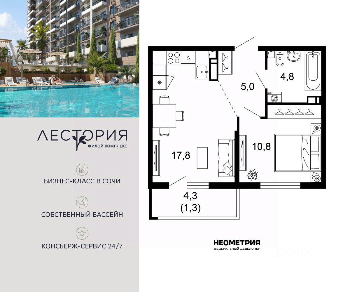 Продается квартира в жилом комплексе бизнес-класса "Лестория". В составе ЖК предусмотрена собственная аквазона площадью 473 квадратных метра с двумя подогреваемыми бассейнами, что соответствуют стандартам бизнес-класса. Аквазона объединяет взрослый и детский бассейны. В welcome-zone к услугам посетителей шезлонги и все необходимые принадлежности. Раздевалки с душевыми комнатами, инфракрасная сауна — здесь все предусмотрено для комфортного отдыха и полного расслабления. Для водного комплекса продуман отдельный вход, оборудованный системой контроля и управления доступом (СКУД). Аквазона только часть уникальной инфраструктуры "Лестории", которая включает в себя также благоустроенную территорию с пятьюдесятью функциональными зонами для прогулок, отдыха и занятий спортом, видовые террасы на крышах для отдыха, работы и встреч с друзьями, а также пространство набережной Кудепсты с шезлонгами и перголами. Жилой комплекс "Лестория" состоит из шести домов высотностью от 15 до 17 этажей, окружённых зеленым массивом национального парка. На придомовой территории для жителей предусмотрены закрытые дворы с круглосуточным видеонаблюдением, активити-центр для детей и подростков, тихие зоны для отдыха и медитации. На крышах домов будут созданы зеленые террасы для наслаждения прекрасными видами на море и горы. В проекте предусмотрены разные варианты отделки квартир под потребности покупателей. Тем, кто хочет воплотить в жизнь собственные интерьерные задумки, подойдут квартиры без ремонта. Для комфортной жизни и отдыха в комплексе будет работать круглосуточный консьерж-сервис уровня 5*, который с легкостью закроет все ежедневные потребности: от заказа продуктов и встречи гостей в аэропорту до выгула и дрессировки питомца. К услугам жителей ЖК "Лестория" — собственная управляющая компания, для инвесторов предоставляются услуги доверительного управления.