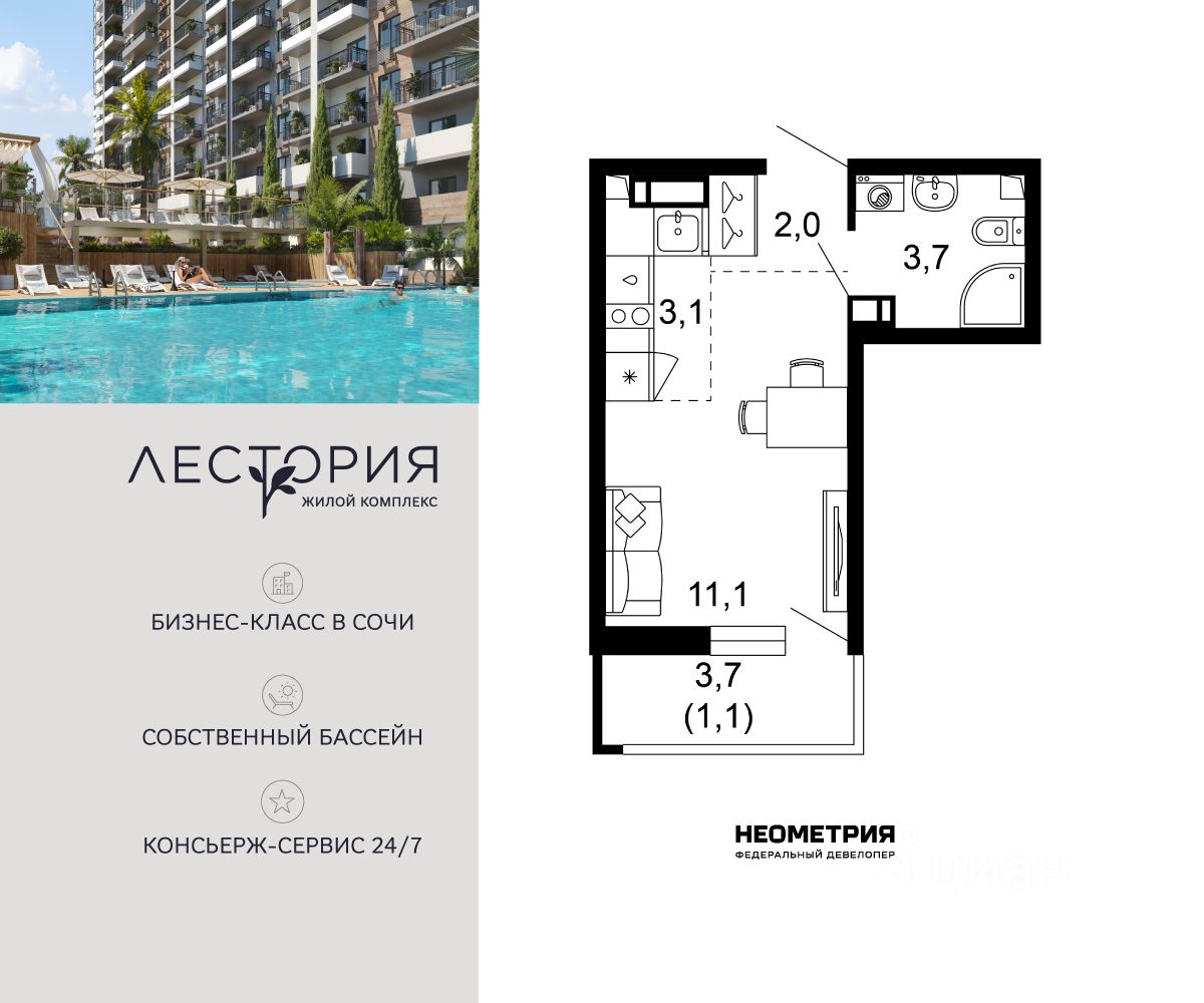 Продается квартира в жилом комплексе бизнес-класса "Лестория". В составе ЖК предусмотрена собственная аквазона площадью 473 квадратных метра с двумя подогреваемыми бассейнами, что соответствуют стандартам бизнес-класса. Аквазона объединяет взрослый и детский бассейны. В welcome-zone к услугам посетителей шезлонги и все необходимые принадлежности. Раздевалки с душевыми комнатами, инфракрасная сауна — здесь все предусмотрено для комфортного отдыха и полного расслабления. Для водного комплекса продуман отдельный вход, оборудованный системой контроля и управления доступом (СКУД). Аквазона только часть уникальной инфраструктуры "Лестории", которая включает в себя также благоустроенную территорию с пятьюдесятью функциональными зонами для прогулок, отдыха и занятий спортом, видовые террасы на крышах для отдыха, работы и встреч с друзьями, а также пространство набережной Кудепсты с шезлонгами и перголами. Жилой комплекс "Лестория" состоит из шести домов высотностью от 15 до 17 этажей, окружённых зеленым массивом национального парка. На придомовой территории для жителей предусмотрены закрытые дворы с круглосуточным видеонаблюдением, активити-центр для детей и подростков, тихие зоны для отдыха и медитации. На крышах домов будут созданы зеленые террасы для наслаждения прекрасными видами на море и горы. В проекте предусмотрены разные варианты отделки квартир под потребности покупателей. Тем, кто хочет воплотить в жизнь собственные интерьерные задумки, подойдут квартиры без ремонта. Для комфортной жизни и отдыха в комплексе будет работать круглосуточный консьерж-сервис уровня 5*, который с легкостью закроет все ежедневные потребности: от заказа продуктов и встречи гостей в аэропорту до выгула и дрессировки питомца. К услугам жителей ЖК "Лестория" — собственная управляющая компания, для инвесторов предоставляются услуги доверительного управления.