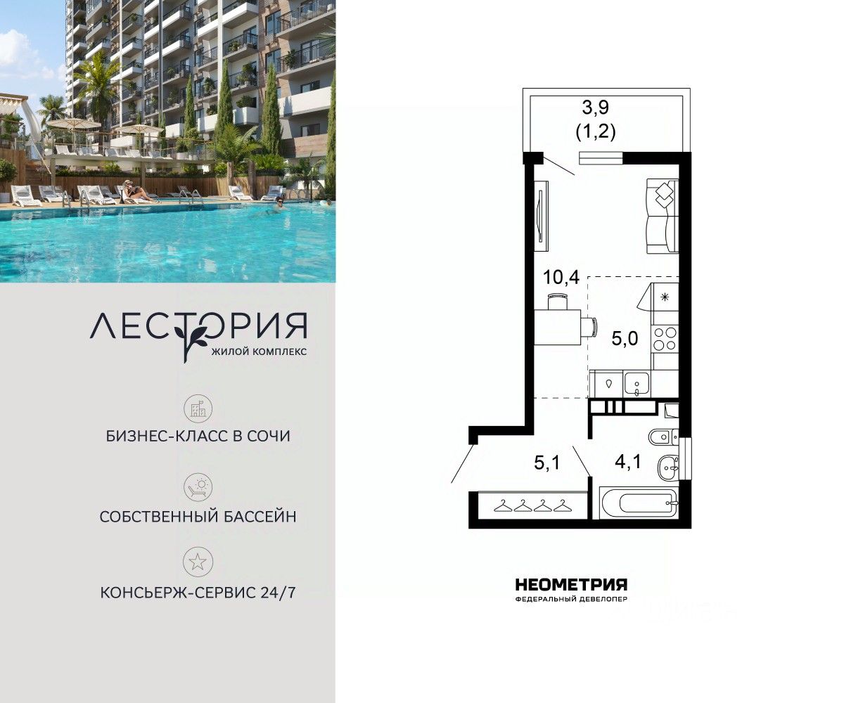 Продается квартира в жилом комплексе бизнес-класса "Лестория". В составе ЖК предусмотрена собственная аквазона площадью 473 квадратных метра с двумя подогреваемыми бассейнами, что соответствуют стандартам бизнес-класса. Аквазона объединяет взрослый и детский бассейны. В welcome-zone к услугам посетителей шезлонги и все необходимые принадлежности. Раздевалки с душевыми комнатами, инфракрасная сауна — здесь все предусмотрено для комфортного отдыха и полного расслабления. Для водного комплекса продуман отдельный вход, оборудованный системой контроля и управления доступом (СКУД). Аквазона только часть уникальной инфраструктуры "Лестории", которая включает в себя также благоустроенную территорию с пятьюдесятью функциональными зонами для прогулок, отдыха и занятий спортом, видовые террасы на крышах для отдыха, работы и встреч с друзьями, а также пространство набережной Кудепсты с шезлонгами и перголами. Жилой комплекс "Лестория" состоит из шести домов высотностью от 15 до 17 этажей, окружённых зеленым массивом национального парка. На придомовой территории для жителей предусмотрены закрытые дворы с круглосуточным видеонаблюдением, активити-центр для детей и подростков, тихие зоны для отдыха и медитации. На крышах домов будут созданы зеленые террасы для наслаждения прекрасными видами на море и горы. В проекте предусмотрены разные варианты отделки квартир под потребности покупателей. Тем, кто хочет воплотить в жизнь собственные интерьерные задумки, подойдут квартиры без ремонта. Для комфортной жизни и отдыха в комплексе будет работать круглосуточный консьерж-сервис уровня 5*, который с легкостью закроет все ежедневные потребности: от заказа продуктов и встречи гостей в аэропорту до выгула и дрессировки питомца. К услугам жителей ЖК "Лестория" — собственная управляющая компания, для инвесторов предоставляются услуги доверительного управления.