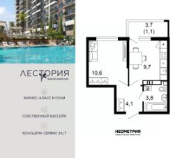 Продается квартира в жилом комплексе бизнес-класса "Лестория". В составе ЖК предусмотрена собственная аквазона площадью 473 квадратных метра с двумя подогреваемыми бассейнами, что соответствуют стандартам бизнес-класса. Аквазона объединяет взрослый и детский бассейны. В welcome-zone к услугам посетителей шезлонги и все необходимые принадлежности. Раздевалки с душевыми комнатами, инфракрасная сауна — здесь все предусмотрено для комфортного отдыха и полного расслабления. Для водного комплекса продуман отдельный вход, оборудованный системой контроля и управления доступом (СКУД). Аквазона только часть уникальной инфраструктуры "Лестории", которая включает в себя также благоустроенную территорию с пятьюдесятью функциональными зонами для прогулок, отдыха и занятий спортом, видовые террасы на крышах для отдыха, работы и встреч с друзьями, а также пространство набережной Кудепсты с шезлонгами и перголами. Жилой комплекс "Лестория" состоит из шести домов высотностью от 15 до 17 этажей, окружённых зеленым массивом национального парка. На придомовой территории для жителей предусмотрены закрытые дворы с круглосуточным видеонаблюдением, активити-центр для детей и подростков, тихие зоны для отдыха и медитации. На крышах домов будут созданы зеленые террасы для наслаждения прекрасными видами на море и горы. В проекте предусмотрены разные варианты отделки квартир под потребности покупателей. Тем, кто хочет воплотить в жизнь собственные интерьерные задумки, подойдут квартиры без ремонта. Для комфортной жизни и отдыха в комплексе будет работать круглосуточный консьерж-сервис уровня 5*, который с легкостью закроет все ежедневные потребности: от заказа продуктов и встречи гостей в аэропорту до выгула и дрессировки питомца. К услугам жителей ЖК "Лестория" — собственная управляющая компания, для инвесторов предоставляются услуги доверительного управления.