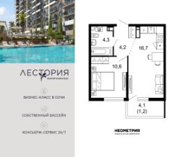 Продается квартира в жилом комплексе бизнес-класса "Лестория". В составе ЖК предусмотрена собственная аквазона площадью 473 квадратных метра с двумя подогреваемыми бассейнами, что соответствуют стандартам бизнес-класса. Аквазона объединяет взрослый и детский бассейны. В welcome-zone к услугам посетителей шезлонги и все необходимые принадлежности. Раздевалки с душевыми комнатами, инфракрасная сауна — здесь все предусмотрено для комфортного отдыха и полного расслабления. Для водного комплекса продуман отдельный вход, оборудованный системой контроля и управления доступом (СКУД). Аквазона только часть уникальной инфраструктуры "Лестории", которая включает в себя также благоустроенную территорию с пятьюдесятью функциональными зонами для прогулок, отдыха и занятий спортом, видовые террасы на крышах для отдыха, работы и встреч с друзьями, а также пространство набережной Кудепсты с шезлонгами и перголами. Жилой комплекс "Лестория" состоит из шести домов высотностью от 15 до 17 этажей, окружённых зеленым массивом национального парка. На придомовой территории для жителей предусмотрены закрытые дворы с круглосуточным видеонаблюдением, активити-центр для детей и подростков, тихие зоны для отдыха и медитации. На крышах домов будут созданы зеленые террасы для наслаждения прекрасными видами на море и горы. В проекте предусмотрены разные варианты отделки квартир под потребности покупателей. Тем, кто хочет воплотить в жизнь собственные интерьерные задумки, подойдут квартиры без ремонта. Для комфортной жизни и отдыха в комплексе будет работать круглосуточный консьерж-сервис уровня 5*, который с легкостью закроет все ежедневные потребности: от заказа продуктов и встречи гостей в аэропорту до выгула и дрессировки питомца. К услугам жителей ЖК "Лестория" — собственная управляющая компания, для инвесторов предоставляются услуги доверительного управления.