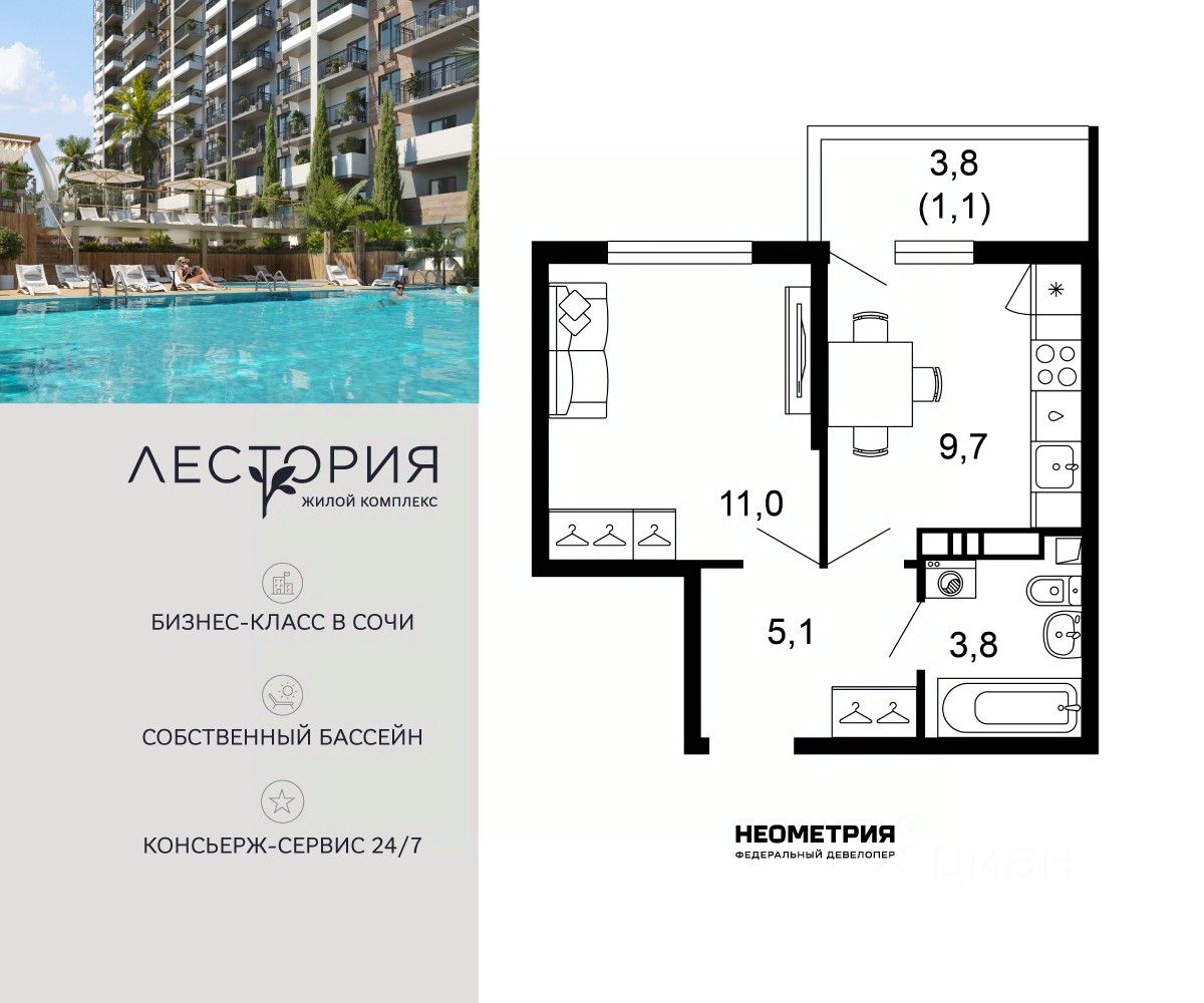 Продается квартира в жилом комплексе бизнес-класса "Лестория". В составе ЖК предусмотрена собственная аквазона площадью 473 квадратных метра с двумя подогреваемыми бассейнами, что соответствуют стандартам бизнес-класса. Аквазона объединяет взрослый и детский бассейны. В welcome-zone к услугам посетителей шезлонги и все необходимые принадлежности. Раздевалки с душевыми комнатами, инфракрасная сауна — здесь все предусмотрено для комфортного отдыха и полного расслабления. Для водного комплекса продуман отдельный вход, оборудованный системой контроля и управления доступом (СКУД). Аквазона только часть уникальной инфраструктуры "Лестории", которая включает в себя также благоустроенную территорию с пятьюдесятью функциональными зонами для прогулок, отдыха и занятий спортом, видовые террасы на крышах для отдыха, работы и встреч с друзьями, а также пространство набережной Кудепсты с шезлонгами и перголами. Жилой комплекс "Лестория" состоит из шести домов высотностью от 15 до 17 этажей, окружённых зеленым массивом национального парка. На придомовой территории для жителей предусмотрены закрытые дворы с круглосуточным видеонаблюдением, активити-центр для детей и подростков, тихие зоны для отдыха и медитации. На крышах домов будут созданы зеленые террасы для наслаждения прекрасными видами на море и горы. В проекте предусмотрены разные варианты отделки квартир под потребности покупателей. Тем, кто хочет воплотить в жизнь собственные интерьерные задумки, подойдут квартиры без ремонта. Для комфортной жизни и отдыха в комплексе будет работать круглосуточный консьерж-сервис уровня 5*, который с легкостью закроет все ежедневные потребности: от заказа продуктов и встречи гостей в аэропорту до выгула и дрессировки питомца. К услугам жителей ЖК "Лестория" — собственная управляющая компания, для инвесторов предоставляются услуги доверительного управления.