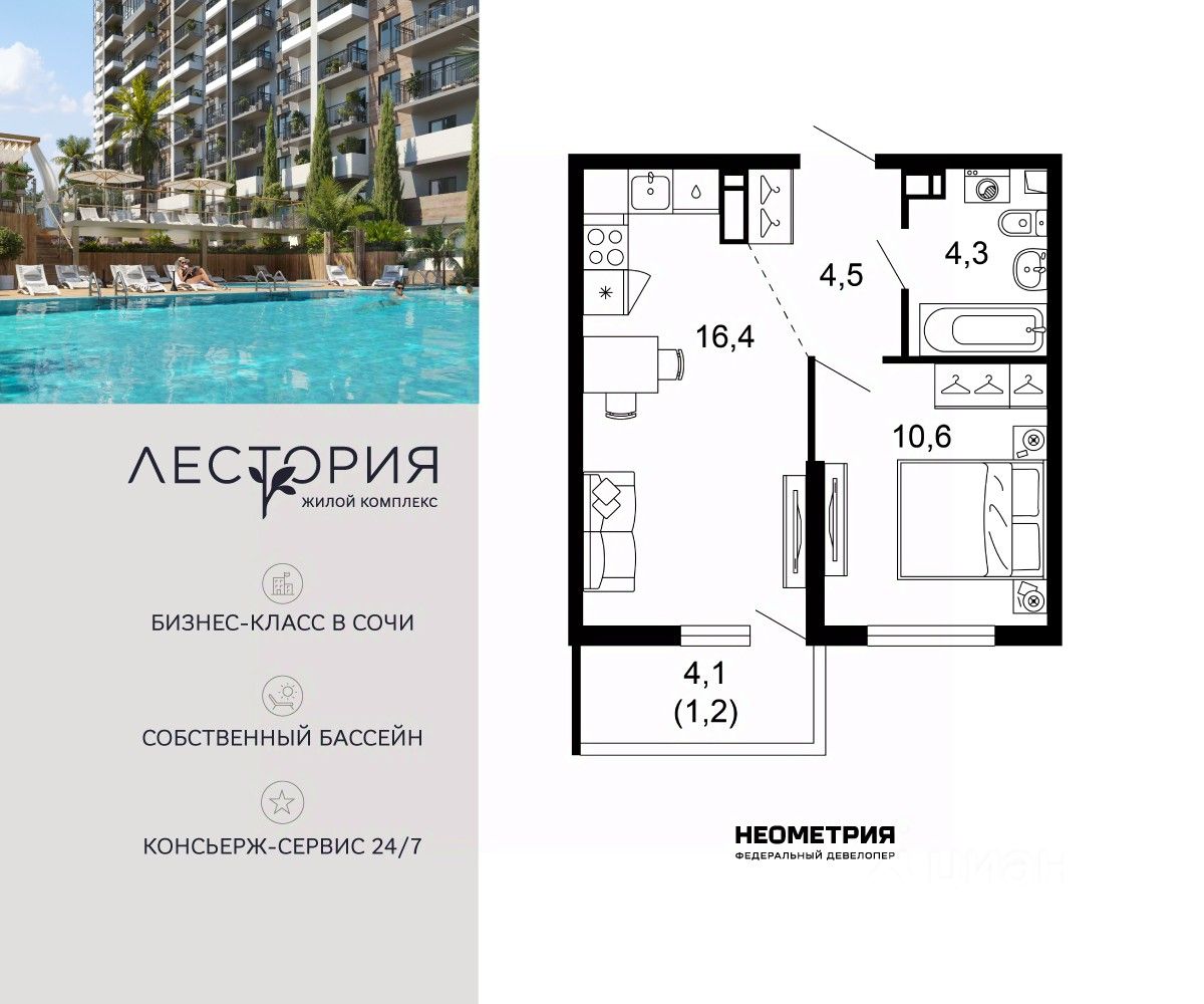 Продается квартира в жилом комплексе бизнес-класса "Лестория". В составе ЖК предусмотрена собственная аквазона площадью 473 квадратных метра с двумя подогреваемыми бассейнами, что соответствуют стандартам бизнес-класса. Аквазона объединяет взрослый и детский бассейны. В welcome-zone к услугам посетителей шезлонги и все необходимые принадлежности. Раздевалки с душевыми комнатами, инфракрасная сауна — здесь все предусмотрено для комфортного отдыха и полного расслабления. Для водного комплекса продуман отдельный вход, оборудованный системой контроля и управления доступом (СКУД). Аквазона только часть уникальной инфраструктуры "Лестории", которая включает в себя также благоустроенную территорию с пятьюдесятью функциональными зонами для прогулок, отдыха и занятий спортом, видовые террасы на крышах для отдыха, работы и встреч с друзьями, а также пространство набережной Кудепсты с шезлонгами и перголами. Жилой комплекс "Лестория" состоит из шести домов высотностью от 15 до 17 этажей, окружённых зеленым массивом национального парка. На придомовой территории для жителей предусмотрены закрытые дворы с круглосуточным видеонаблюдением, активити-центр для детей и подростков, тихие зоны для отдыха и медитации. На крышах домов будут созданы зеленые террасы для наслаждения прекрасными видами на море и горы. В проекте предусмотрены разные варианты отделки квартир под потребности покупателей. Тем, кто хочет воплотить в жизнь собственные интерьерные задумки, подойдут квартиры без ремонта. Для комфортной жизни и отдыха в комплексе будет работать круглосуточный консьерж-сервис уровня 5*, который с легкостью закроет все ежедневные потребности: от заказа продуктов и встречи гостей в аэропорту до выгула и дрессировки питомца. К услугам жителей ЖК "Лестория" — собственная управляющая компания, для инвесторов предоставляются услуги доверительного управления.