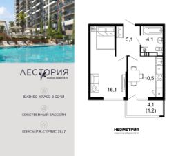 Продается квартира в жилом комплексе бизнес-класса "Лестория". В составе ЖК предусмотрена собственная аквазона площадью 473 квадратных метра с двумя подогреваемыми бассейнами, что соответствуют стандартам бизнес-класса. Аквазона объединяет взрослый и детский бассейны. В welcome-zone к услугам посетителей шезлонги и все необходимые принадлежности. Раздевалки с душевыми комнатами, инфракрасная сауна — здесь все предусмотрено для комфортного отдыха и полного расслабления. Для водного комплекса продуман отдельный вход, оборудованный системой контроля и управления доступом (СКУД). Аквазона только часть уникальной инфраструктуры "Лестории", которая включает в себя также благоустроенную территорию с пятьюдесятью функциональными зонами для прогулок, отдыха и занятий спортом, видовые террасы на крышах для отдыха, работы и встреч с друзьями, а также пространство набережной Кудепсты с шезлонгами и перголами. Жилой комплекс "Лестория" состоит из шести домов высотностью от 15 до 17 этажей, окружённых зеленым массивом национального парка. На придомовой территории для жителей предусмотрены закрытые дворы с круглосуточным видеонаблюдением, активити-центр для детей и подростков, тихие зоны для отдыха и медитации. На крышах домов будут созданы зеленые террасы для наслаждения прекрасными видами на море и горы. В проекте предусмотрены разные варианты отделки квартир под потребности покупателей. Тем, кто хочет воплотить в жизнь собственные интерьерные задумки, подойдут квартиры без ремонта. Для комфортной жизни и отдыха в комплексе будет работать круглосуточный консьерж-сервис уровня 5*, который с легкостью закроет все ежедневные потребности: от заказа продуктов и встречи гостей в аэропорту до выгула и дрессировки питомца. К услугам жителей ЖК "Лестория" — собственная управляющая компания, для инвесторов предоставляются услуги доверительного управления.