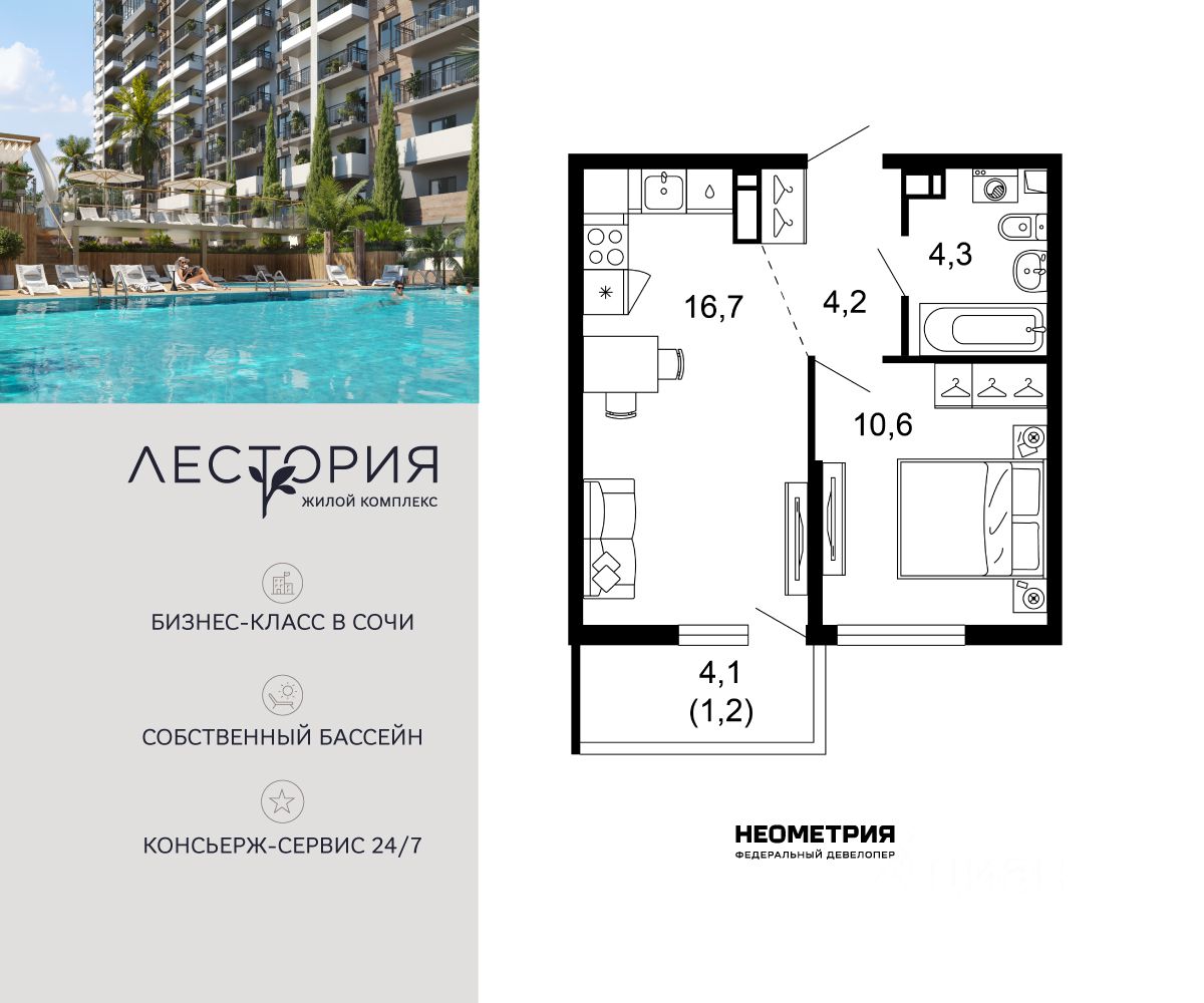 Продается квартира в жилом комплексе бизнес-класса "Лестория". В составе ЖК предусмотрена собственная аквазона площадью 473 квадратных метра с двумя подогреваемыми бассейнами, что соответствуют стандартам бизнес-класса. Аквазона объединяет взрослый и детский бассейны. В welcome-zone к услугам посетителей шезлонги и все необходимые принадлежности. Раздевалки с душевыми комнатами, инфракрасная сауна — здесь все предусмотрено для комфортного отдыха и полного расслабления. Для водного комплекса продуман отдельный вход, оборудованный системой контроля и управления доступом (СКУД). Аквазона только часть уникальной инфраструктуры "Лестории", которая включает в себя также благоустроенную территорию с пятьюдесятью функциональными зонами для прогулок, отдыха и занятий спортом, видовые террасы на крышах для отдыха, работы и встреч с друзьями, а также пространство набережной Кудепсты с шезлонгами и перголами. Жилой комплекс "Лестория" состоит из шести домов высотностью от 15 до 17 этажей, окружённых зеленым массивом национального парка. На придомовой территории для жителей предусмотрены закрытые дворы с круглосуточным видеонаблюдением, активити-центр для детей и подростков, тихие зоны для отдыха и медитации. На крышах домов будут созданы зеленые террасы для наслаждения прекрасными видами на море и горы. В проекте предусмотрены разные варианты отделки квартир под потребности покупателей. Тем, кто хочет воплотить в жизнь собственные интерьерные задумки, подойдут квартиры без ремонта. Для комфортной жизни и отдыха в комплексе будет работать круглосуточный консьерж-сервис уровня 5*, который с легкостью закроет все ежедневные потребности: от заказа продуктов и встречи гостей в аэропорту до выгула и дрессировки питомца. К услугам жителей ЖК "Лестория" — собственная управляющая компания, для инвесторов предоставляются услуги доверительного управления.