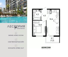Продается квартира в жилом комплексе бизнес-класса "Лестория". В составе ЖК предусмотрена собственная аквазона площадью 473 квадратных метра с двумя подогреваемыми бассейнами, что соответствуют стандартам бизнес-класса. Аквазона объединяет взрослый и детский бассейны. В welcome-zone к услугам посетителей шезлонги и все необходимые принадлежности. Раздевалки с душевыми комнатами, инфракрасная сауна — здесь все предусмотрено для комфортного отдыха и полного расслабления. Для водного комплекса продуман отдельный вход, оборудованный системой контроля и управления доступом (СКУД). Аквазона только часть уникальной инфраструктуры "Лестории", которая включает в себя также благоустроенную территорию с пятьюдесятью функциональными зонами для прогулок, отдыха и занятий спортом, видовые террасы на крышах для отдыха, работы и встреч с друзьями, а также пространство набережной Кудепсты с шезлонгами и перголами. Жилой комплекс "Лестория" состоит из шести домов высотностью от 15 до 17 этажей, окружённых зеленым массивом национального парка. На придомовой территории для жителей предусмотрены закрытые дворы с круглосуточным видеонаблюдением, активити-центр для детей и подростков, тихие зоны для отдыха и медитации. На крышах домов будут созданы зеленые террасы для наслаждения прекрасными видами на море и горы. В проекте предусмотрены разные варианты отделки квартир под потребности покупателей. Тем, кто хочет воплотить в жизнь собственные интерьерные задумки, подойдут квартиры без ремонта. Для комфортной жизни и отдыха в комплексе будет работать круглосуточный консьерж-сервис уровня 5*, который с легкостью закроет все ежедневные потребности: от заказа продуктов и встречи гостей в аэропорту до выгула и дрессировки питомца. К услугам жителей ЖК "Лестория" — собственная управляющая компания, для инвесторов предоставляются услуги доверительного управления.
