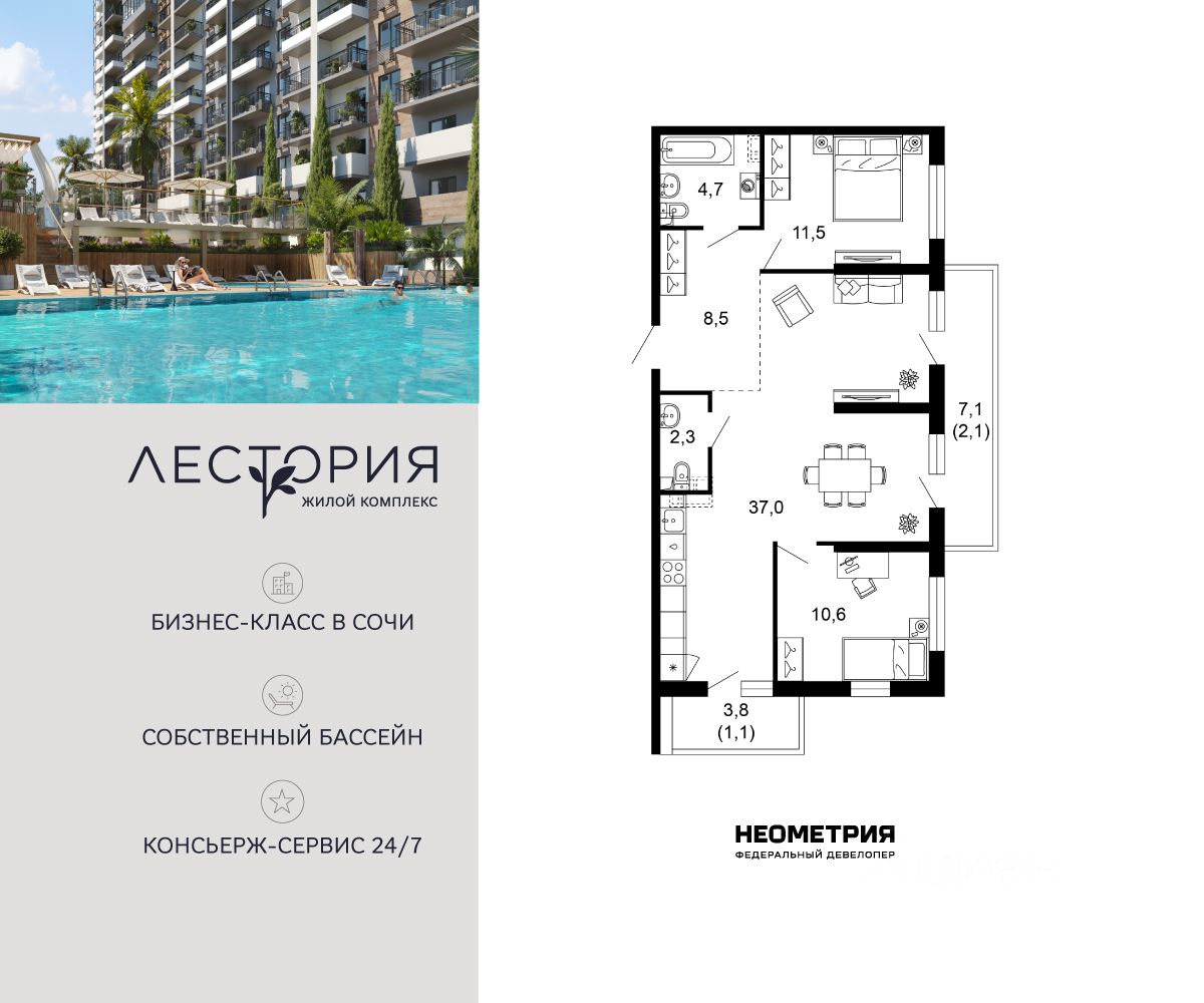 Продается квартира в жилом комплексе бизнес-класса "Лестория". В составе ЖК предусмотрена собственная аквазона площадью 473 квадратных метра с двумя подогреваемыми бассейнами, что соответствуют стандартам бизнес-класса. Аквазона объединяет взрослый и детский бассейны. В welcome-zone к услугам посетителей шезлонги и все необходимые принадлежности. Раздевалки с душевыми комнатами, инфракрасная сауна — здесь все предусмотрено для комфортного отдыха и полного расслабления. Для водного комплекса продуман отдельный вход, оборудованный системой контроля и управления доступом (СКУД). Аквазона только часть уникальной инфраструктуры "Лестории", которая включает в себя также благоустроенную территорию с пятьюдесятью функциональными зонами для прогулок, отдыха и занятий спортом, видовые террасы на крышах для отдыха, работы и встреч с друзьями, а также пространство набережной Кудепсты с шезлонгами и перголами. Жилой комплекс "Лестория" состоит из шести домов высотностью от 15 до 17 этажей, окружённых зеленым массивом национального парка. На придомовой территории для жителей предусмотрены закрытые дворы с круглосуточным видеонаблюдением, активити-центр для детей и подростков, тихие зоны для отдыха и медитации. На крышах домов будут созданы зеленые террасы для наслаждения прекрасными видами на море и горы. В проекте предусмотрены разные варианты отделки квартир под потребности покупателей. Тем, кто хочет воплотить в жизнь собственные интерьерные задумки, подойдут квартиры без ремонта. Для комфортной жизни и отдыха в комплексе будет работать круглосуточный консьерж-сервис уровня 5*, который с легкостью закроет все ежедневные потребности: от заказа продуктов и встречи гостей в аэропорту до выгула и дрессировки питомца. К услугам жителей ЖК "Лестория" — собственная управляющая компания, для инвесторов предоставляются услуги доверительного управления.