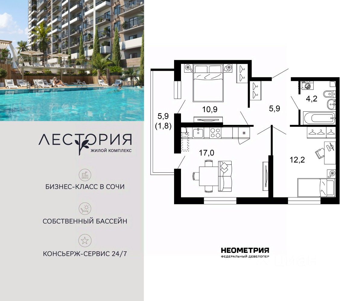 Продается квартира в жилом комплексе бизнес-класса "Лестория". В составе ЖК предусмотрена собственная аквазона площадью 473 квадратных метра с двумя подогреваемыми бассейнами, что соответствуют стандартам бизнес-класса. Аквазона объединяет взрослый и детский бассейны. В welcome-zone к услугам посетителей шезлонги и все необходимые принадлежности. Раздевалки с душевыми комнатами, инфракрасная сауна — здесь все предусмотрено для комфортного отдыха и полного расслабления. Для водного комплекса продуман отдельный вход, оборудованный системой контроля и управления доступом (СКУД). Аквазона только часть уникальной инфраструктуры "Лестории", которая включает в себя также благоустроенную территорию с пятьюдесятью функциональными зонами для прогулок, отдыха и занятий спортом, видовые террасы на крышах для отдыха, работы и встреч с друзьями, а также пространство набережной Кудепсты с шезлонгами и перголами. Жилой комплекс "Лестория" состоит из шести домов высотностью от 15 до 17 этажей, окружённых зеленым массивом национального парка. На придомовой территории для жителей предусмотрены закрытые дворы с круглосуточным видеонаблюдением, активити-центр для детей и подростков, тихие зоны для отдыха и медитации. На крышах домов будут созданы зеленые террасы для наслаждения прекрасными видами на море и горы. В проекте предусмотрены разные варианты отделки квартир под потребности покупателей. Тем, кто хочет воплотить в жизнь собственные интерьерные задумки, подойдут квартиры без ремонта. Для комфортной жизни и отдыха в комплексе будет работать круглосуточный консьерж-сервис уровня 5*, который с легкостью закроет все ежедневные потребности: от заказа продуктов и встречи гостей в аэропорту до выгула и дрессировки питомца. К услугам жителей ЖК "Лестория" — собственная управляющая компания, для инвесторов предоставляются услуги доверительного управления.