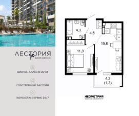 Продается квартира в жилом комплексе бизнес-класса "Лестория". В составе ЖК предусмотрена собственная аквазона площадью 473 квадратных метра с двумя подогреваемыми бассейнами, что соответствуют стандартам бизнес-класса. Аквазона объединяет взрослый и детский бассейны. В welcome-zone к услугам посетителей шезлонги и все необходимые принадлежности. Раздевалки с душевыми комнатами, инфракрасная сауна — здесь все предусмотрено для комфортного отдыха и полного расслабления. Для водного комплекса продуман отдельный вход, оборудованный системой контроля и управления доступом (СКУД). Аквазона только часть уникальной инфраструктуры "Лестории", которая включает в себя также благоустроенную территорию с пятьюдесятью функциональными зонами для прогулок, отдыха и занятий спортом, видовые террасы на крышах для отдыха, работы и встреч с друзьями, а также пространство набережной Кудепсты с шезлонгами и перголами. Жилой комплекс "Лестория" состоит из шести домов высотностью от 15 до 17 этажей, окружённых зеленым массивом национального парка. На придомовой территории для жителей предусмотрены закрытые дворы с круглосуточным видеонаблюдением, активити-центр для детей и подростков, тихие зоны для отдыха и медитации. На крышах домов будут созданы зеленые террасы для наслаждения прекрасными видами на море и горы. В проекте предусмотрены разные варианты отделки квартир под потребности покупателей. Тем, кто хочет воплотить в жизнь собственные интерьерные задумки, подойдут квартиры без ремонта. Для комфортной жизни и отдыха в комплексе будет работать круглосуточный консьерж-сервис уровня 5*, который с легкостью закроет все ежедневные потребности: от заказа продуктов и встречи гостей в аэропорту до выгула и дрессировки питомца. К услугам жителей ЖК "Лестория" — собственная управляющая компания, для инвесторов предоставляются услуги доверительного управления.