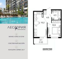 Продается квартира в жилом комплексе бизнес-класса "Лестория". В составе ЖК предусмотрена собственная аквазона площадью 473 квадратных метра с двумя подогреваемыми бассейнами, что соответствуют стандартам бизнес-класса. Аквазона объединяет взрослый и детский бассейны. В welcome-zone к услугам посетителей шезлонги и все необходимые принадлежности. Раздевалки с душевыми комнатами, инфракрасная сауна — здесь все предусмотрено для комфортного отдыха и полного расслабления. Для водного комплекса продуман отдельный вход, оборудованный системой контроля и управления доступом (СКУД). Аквазона только часть уникальной инфраструктуры "Лестории", которая включает в себя также благоустроенную территорию с пятьюдесятью функциональными зонами для прогулок, отдыха и занятий спортом, видовые террасы на крышах для отдыха, работы и встреч с друзьями, а также пространство набережной Кудепсты с шезлонгами и перголами. Жилой комплекс "Лестория" состоит из шести домов высотностью от 15 до 17 этажей, окружённых зеленым массивом национального парка. На придомовой территории для жителей предусмотрены закрытые дворы с круглосуточным видеонаблюдением, активити-центр для детей и подростков, тихие зоны для отдыха и медитации. На крышах домов будут созданы зеленые террасы для наслаждения прекрасными видами на море и горы. В проекте предусмотрены разные варианты отделки квартир под потребности покупателей. Тем, кто хочет воплотить в жизнь собственные интерьерные задумки, подойдут квартиры без ремонта. Для комфортной жизни и отдыха в комплексе будет работать круглосуточный консьерж-сервис уровня 5*, который с легкостью закроет все ежедневные потребности: от заказа продуктов и встречи гостей в аэропорту до выгула и дрессировки питомца. К услугам жителей ЖК "Лестория" — собственная управляющая компания, для инвесторов предоставляются услуги доверительного управления.