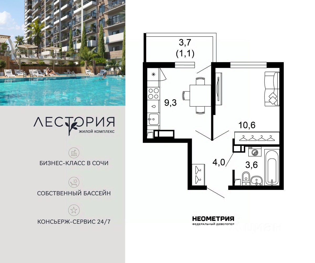 Продается квартира в жилом комплексе бизнес-класса "Лестория". В составе ЖК предусмотрена собственная аквазона площадью 473 квадратных метра с двумя подогреваемыми бассейнами, что соответствуют стандартам бизнес-класса. Аквазона объединяет взрослый и детский бассейны. В welcome-zone к услугам посетителей шезлонги и все необходимые принадлежности. Раздевалки с душевыми комнатами, инфракрасная сауна — здесь все предусмотрено для комфортного отдыха и полного расслабления. Для водного комплекса продуман отдельный вход, оборудованный системой контроля и управления доступом (СКУД). Аквазона только часть уникальной инфраструктуры "Лестории", которая включает в себя также благоустроенную территорию с пятьюдесятью функциональными зонами для прогулок, отдыха и занятий спортом, видовые террасы на крышах для отдыха, работы и встреч с друзьями, а также пространство набережной Кудепсты с шезлонгами и перголами. Жилой комплекс "Лестория" состоит из шести домов высотностью от 15 до 17 этажей, окружённых зеленым массивом национального парка. На придомовой территории для жителей предусмотрены закрытые дворы с круглосуточным видеонаблюдением, активити-центр для детей и подростков, тихие зоны для отдыха и медитации. На крышах домов будут созданы зеленые террасы для наслаждения прекрасными видами на море и горы. В проекте предусмотрены разные варианты отделки квартир под потребности покупателей. Тем, кто хочет воплотить в жизнь собственные интерьерные задумки, подойдут квартиры без ремонта. Для комфортной жизни и отдыха в комплексе будет работать круглосуточный консьерж-сервис уровня 5*, который с легкостью закроет все ежедневные потребности: от заказа продуктов и встречи гостей в аэропорту до выгула и дрессировки питомца. К услугам жителей ЖК "Лестория" — собственная управляющая компания, для инвесторов предоставляются услуги доверительного управления.