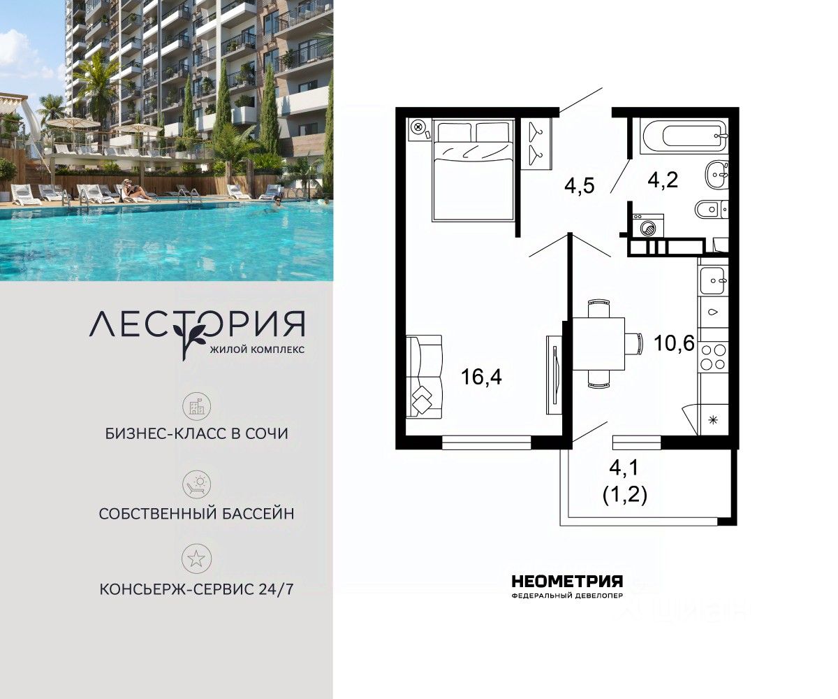 Продается квартира в жилом комплексе бизнес-класса "Лестория". В составе ЖК предусмотрена собственная аквазона площадью 473 квадратных метра с двумя подогреваемыми бассейнами, что соответствуют стандартам бизнес-класса. Аквазона объединяет взрослый и детский бассейны. В welcome-zone к услугам посетителей шезлонги и все необходимые принадлежности. Раздевалки с душевыми комнатами, инфракрасная сауна — здесь все предусмотрено для комфортного отдыха и полного расслабления. Для водного комплекса продуман отдельный вход, оборудованный системой контроля и управления доступом (СКУД). Аквазона только часть уникальной инфраструктуры "Лестории", которая включает в себя также благоустроенную территорию с пятьюдесятью функциональными зонами для прогулок, отдыха и занятий спортом, видовые террасы на крышах для отдыха, работы и встреч с друзьями, а также пространство набережной Кудепсты с шезлонгами и перголами. Жилой комплекс "Лестория" состоит из шести домов высотностью от 15 до 17 этажей, окружённых зеленым массивом национального парка. На придомовой территории для жителей предусмотрены закрытые дворы с круглосуточным видеонаблюдением, активити-центр для детей и подростков, тихие зоны для отдыха и медитации. На крышах домов будут созданы зеленые террасы для наслаждения прекрасными видами на море и горы. В проекте предусмотрены разные варианты отделки квартир под потребности покупателей. Тем, кто хочет воплотить в жизнь собственные интерьерные задумки, подойдут квартиры без ремонта. Для комфортной жизни и отдыха в комплексе будет работать круглосуточный консьерж-сервис уровня 5*, который с легкостью закроет все ежедневные потребности: от заказа продуктов и встречи гостей в аэропорту до выгула и дрессировки питомца. К услугам жителей ЖК "Лестория" — собственная управляющая компания, для инвесторов предоставляются услуги доверительного управления.