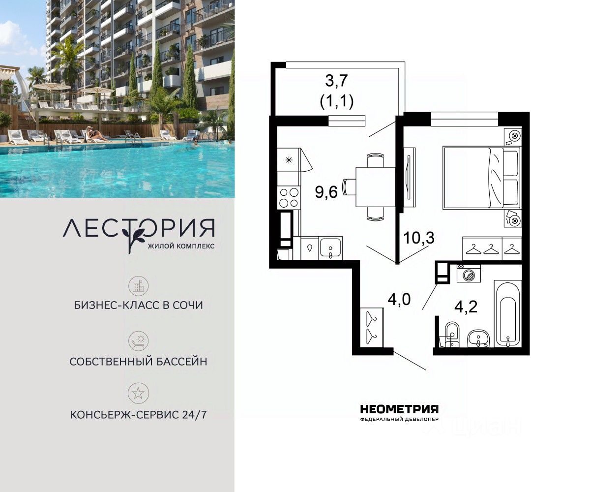 Продается квартира в жилом комплексе бизнес-класса "Лестория". В составе ЖК предусмотрена собственная аквазона площадью 473 квадратных метра с двумя подогреваемыми бассейнами, что соответствуют стандартам бизнес-класса. Аквазона объединяет взрослый и детский бассейны. В welcome-zone к услугам посетителей шезлонги и все необходимые принадлежности. Раздевалки с душевыми комнатами, инфракрасная сауна — здесь все предусмотрено для комфортного отдыха и полного расслабления. Для водного комплекса продуман отдельный вход, оборудованный системой контроля и управления доступом (СКУД). Аквазона только часть уникальной инфраструктуры "Лестории", которая включает в себя также благоустроенную территорию с пятьюдесятью функциональными зонами для прогулок, отдыха и занятий спортом, видовые террасы на крышах для отдыха, работы и встреч с друзьями, а также пространство набережной Кудепсты с шезлонгами и перголами. Жилой комплекс "Лестория" состоит из шести домов высотностью от 15 до 17 этажей, окружённых зеленым массивом национального парка. На придомовой территории для жителей предусмотрены закрытые дворы с круглосуточным видеонаблюдением, активити-центр для детей и подростков, тихие зоны для отдыха и медитации. На крышах домов будут созданы зеленые террасы для наслаждения прекрасными видами на море и горы. В проекте предусмотрены разные варианты отделки квартир под потребности покупателей. Тем, кто хочет воплотить в жизнь собственные интерьерные задумки, подойдут квартиры без ремонта. Для комфортной жизни и отдыха в комплексе будет работать круглосуточный консьерж-сервис уровня 5*, который с легкостью закроет все ежедневные потребности: от заказа продуктов и встречи гостей в аэропорту до выгула и дрессировки питомца. К услугам жителей ЖК "Лестория" — собственная управляющая компания, для инвесторов предоставляются услуги доверительного управления.