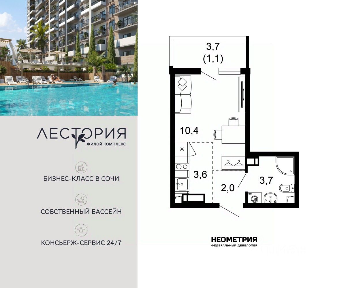Продается квартира в жилом комплексе бизнес-класса "Лестория". В составе ЖК предусмотрена собственная аквазона площадью 473 квадратных метра с двумя подогреваемыми бассейнами, что соответствуют стандартам бизнес-класса. Аквазона объединяет взрослый и детский бассейны. В welcome-zone к услугам посетителей шезлонги и все необходимые принадлежности. Раздевалки с душевыми комнатами, инфракрасная сауна — здесь все предусмотрено для комфортного отдыха и полного расслабления. Для водного комплекса продуман отдельный вход, оборудованный системой контроля и управления доступом (СКУД). Аквазона только часть уникальной инфраструктуры "Лестории", которая включает в себя также благоустроенную территорию с пятьюдесятью функциональными зонами для прогулок, отдыха и занятий спортом, видовые террасы на крышах для отдыха, работы и встреч с друзьями, а также пространство набережной Кудепсты с шезлонгами и перголами. Жилой комплекс "Лестория" состоит из шести домов высотностью от 15 до 17 этажей, окружённых зеленым массивом национального парка. На придомовой территории для жителей предусмотрены закрытые дворы с круглосуточным видеонаблюдением, активити-центр для детей и подростков, тихие зоны для отдыха и медитации. На крышах домов будут созданы зеленые террасы для наслаждения прекрасными видами на море и горы. В проекте предусмотрены разные варианты отделки квартир под потребности покупателей. Тем, кто хочет воплотить в жизнь собственные интерьерные задумки, подойдут квартиры без ремонта. Для комфортной жизни и отдыха в комплексе будет работать круглосуточный консьерж-сервис уровня 5*, который с легкостью закроет все ежедневные потребности: от заказа продуктов и встречи гостей в аэропорту до выгула и дрессировки питомца. К услугам жителей ЖК "Лестория" — собственная управляющая компания, для инвесторов предоставляются услуги доверительного управления.